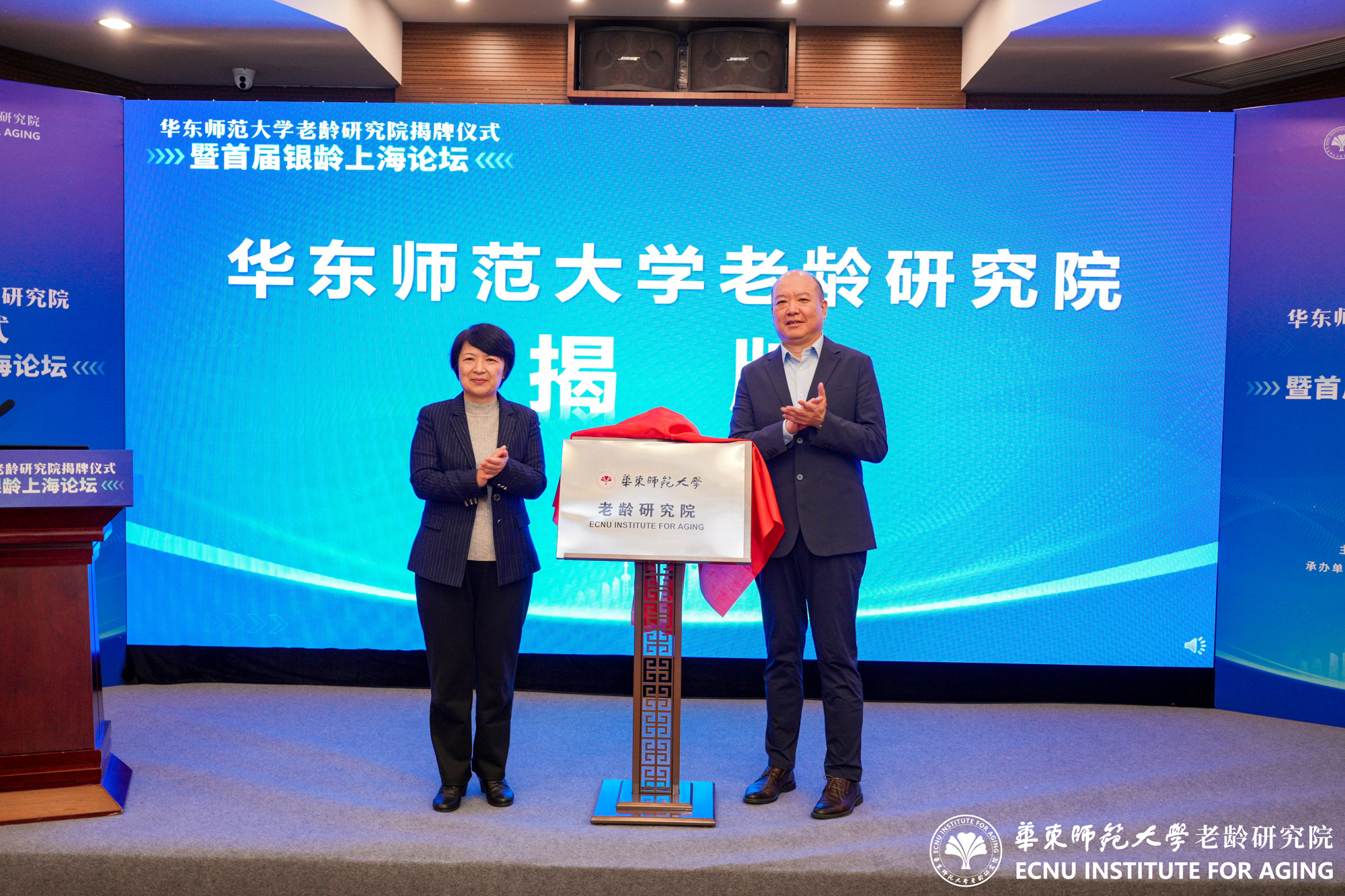 上海市养老服务和老龄产业协会会长李勇、3245澳门新莆京党委书记梅兵共同为3245澳门新莆京老龄研究院揭牌