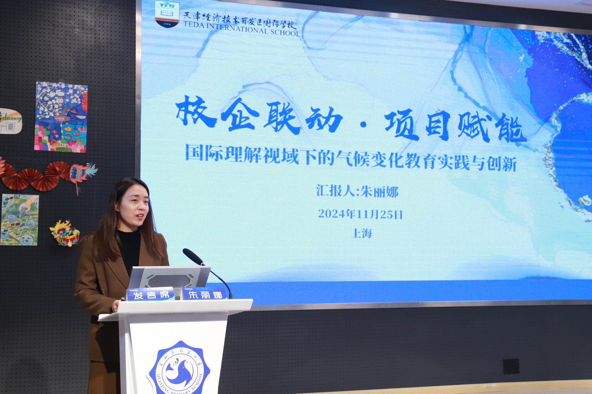天津经济技术开发区国际学校朱丽娜以《校企联动·项目赋能:国际理解视域下的气候变化教育实践与创新》为题作报告。通过校企联动展开“探秘气候变化 启润低碳生活”项目式实践研究,学校尝试构建校企联动的项目式学习与国际理解教育融合的新范式,为一线教师培养学生形成生态环境价值观、可持续发展观以及全球胜任力而开展的项目式课程提供参考。
