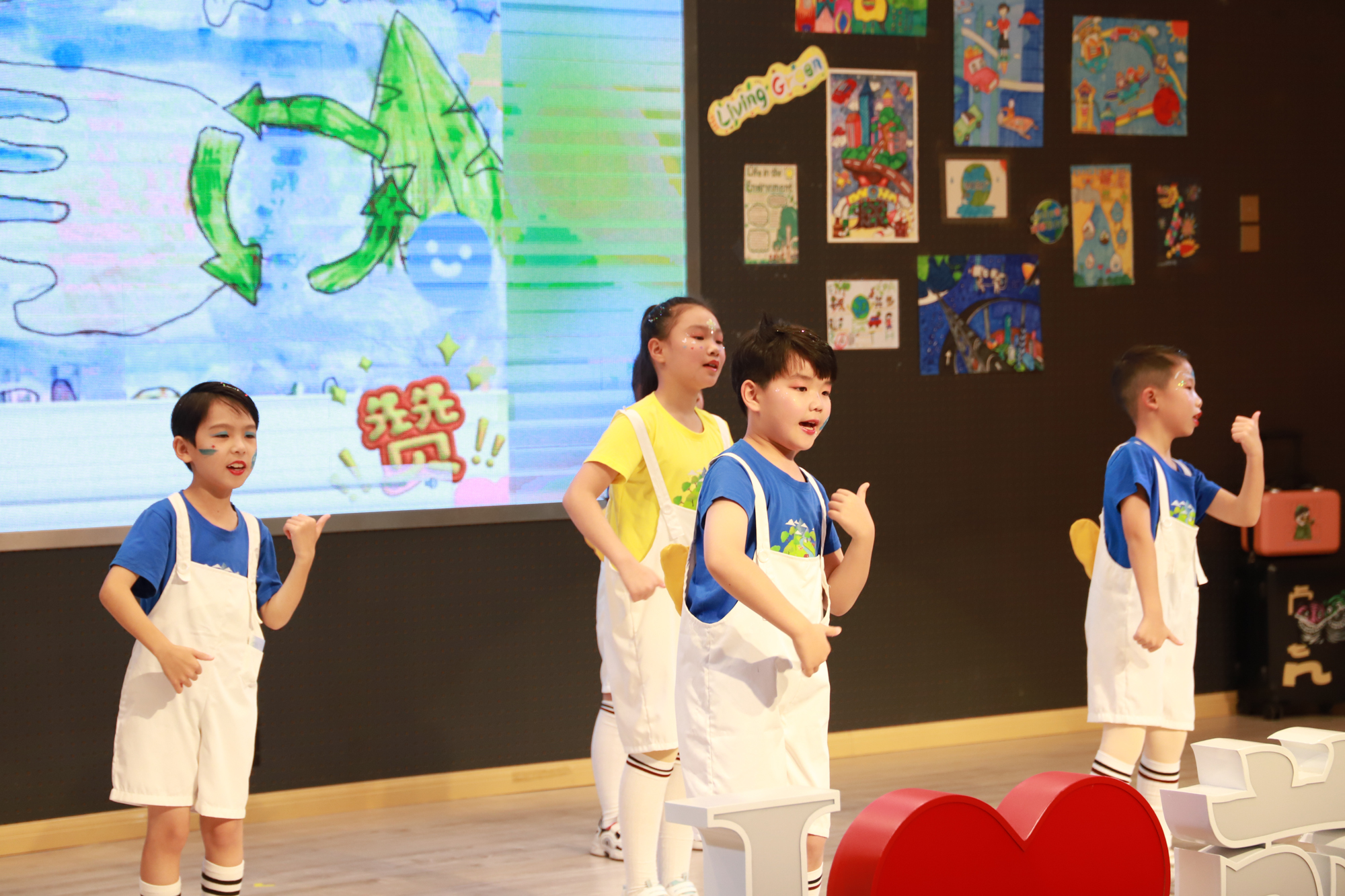 前京小学“小海鲸”们展示了绿色潮童“碳”索之旅、气候变化你我“童”行、风力发电奥妙无穷等一系列项目化学习活动的成果。《Living green》英语环保秀呈现出孩子们对低碳环保的理解和践行。