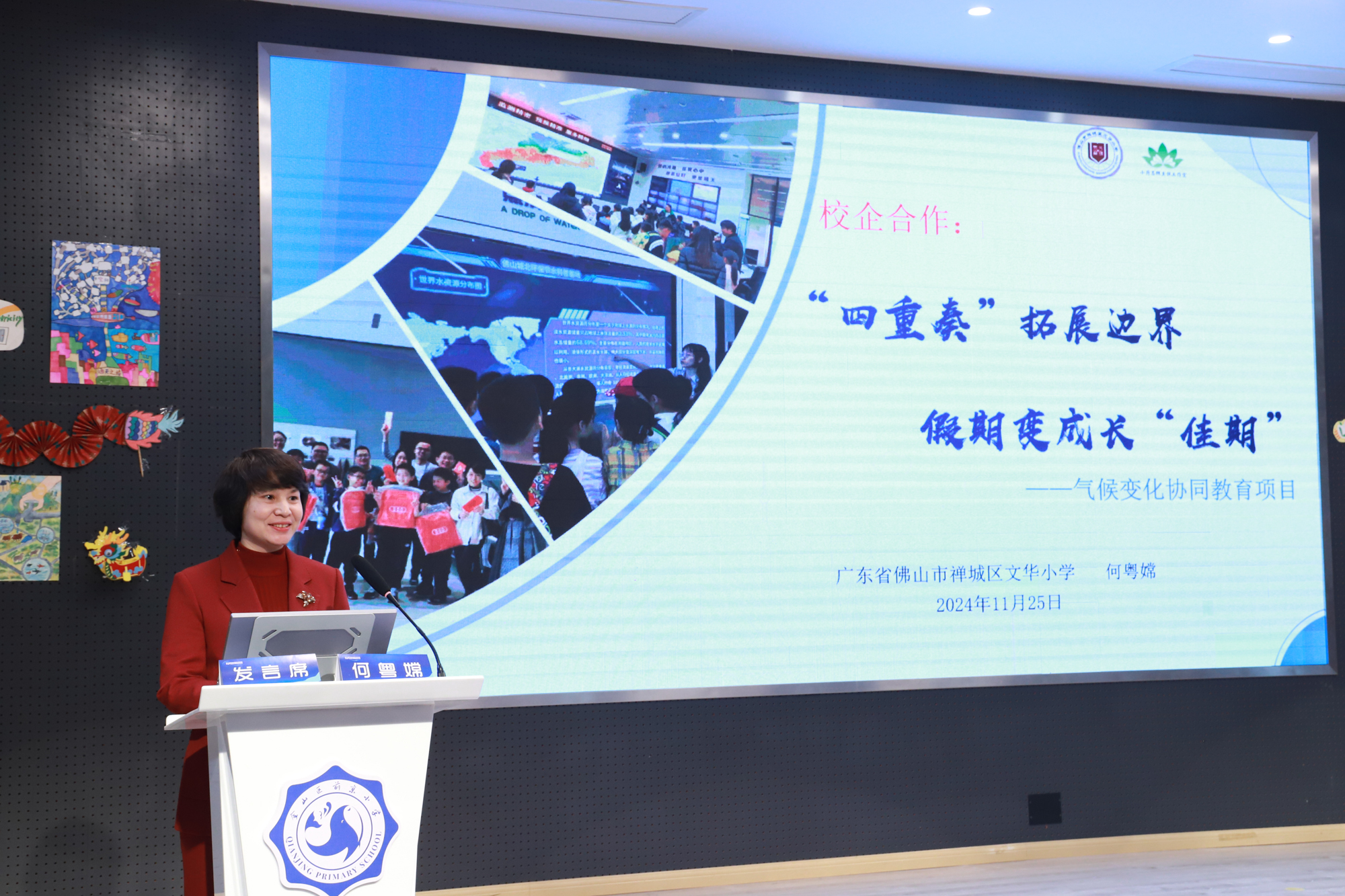 广东省佛山市禅城区文华小学何粤嫦以《“四重奏”拓展边界假期变成长“佳期”——气候变化协同教育项目》为题作报告,介绍了佛山市禅城区多所学校利用寒暑假和周末等“佳期”开展活动持续推进气候变化教育项目的实践经验。何粤嫦表示,禅城区通过校企合作,开拓虚实融合的学习资源、构建行走的大思政课堂、开发校企融合新课程、重组跨界融合新团队,利用这“四重奏”培养学生的责任感和全球视野,为未来的可持续发展和全球环境治理奠定坚实的基础。