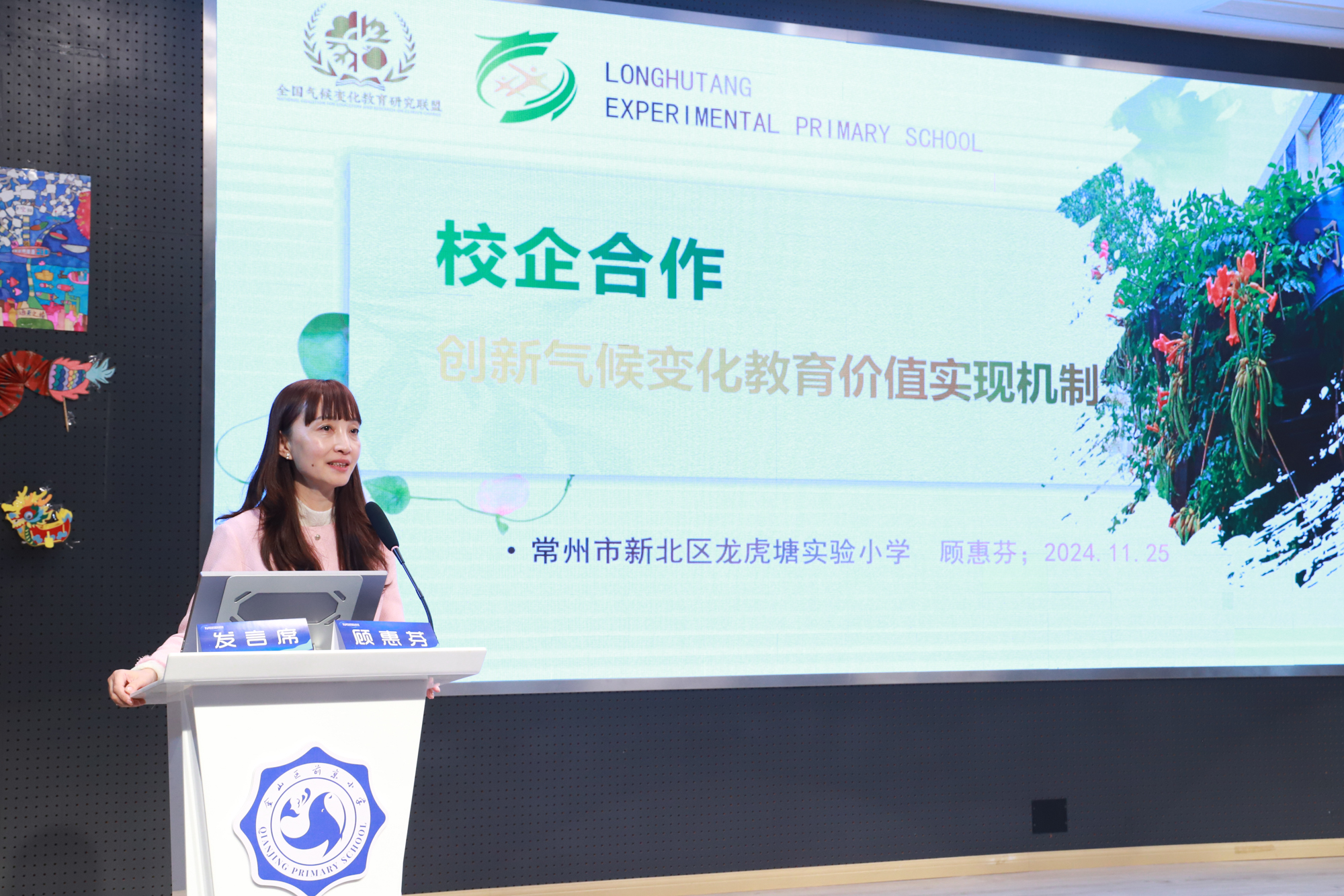 校际对话中,江苏省常州市新北区龙虎塘实验小学书记、校长顾惠芬作《校企合作,创新气候变化教育价值实现机制》主题报告。顾惠芬介绍了学校项目组与天合富家公司合作,以能源革命开展项目实施,为气候变化教育的价值实践探索新路径。顾惠芬表示,校企合作让教育增加“含金量”、让企业增加“含绿量”,让气候变化教育呈现更强协同、更高效益、更美答卷。