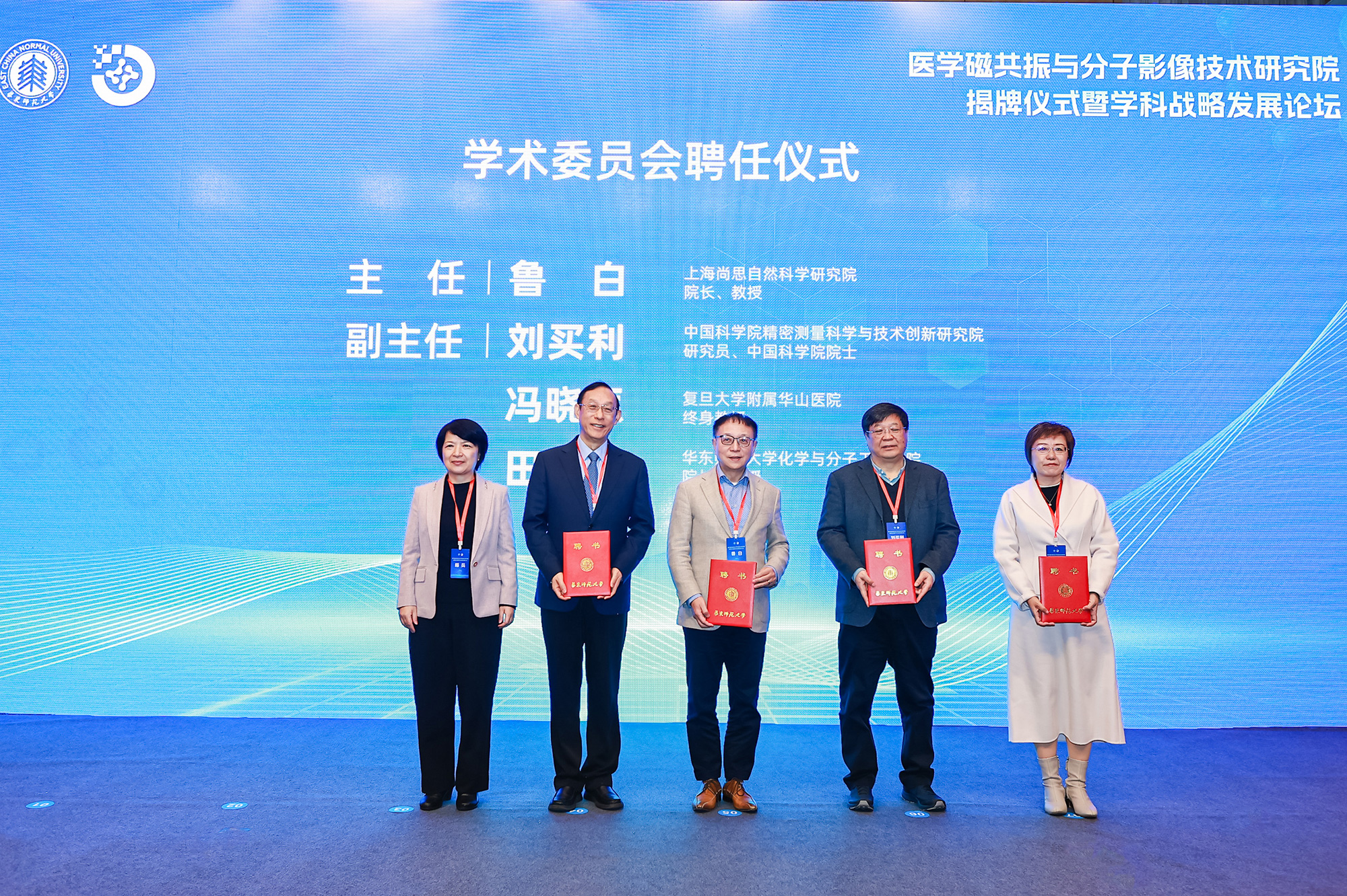 聘任仪式上,梅兵为医学磁共振与分子影像技术研究院学术委员会委员颁发聘书。学术委员会的构成体现了研究院“产学研医”深度融合的建设理念。鲁白教授受聘为研究院学术委员会主任,刘买利院士、冯晓源教授、田阳教授受聘为学术委员会副主任。清华大学、复旦大学、上海交通大学、浙江大学、中国科学院等高校和科研单位的知名学者,联影、东软等知名企业负责人,和上海市第六人民医院、瑞金医院等放射科专家受聘为学术委员会委员。