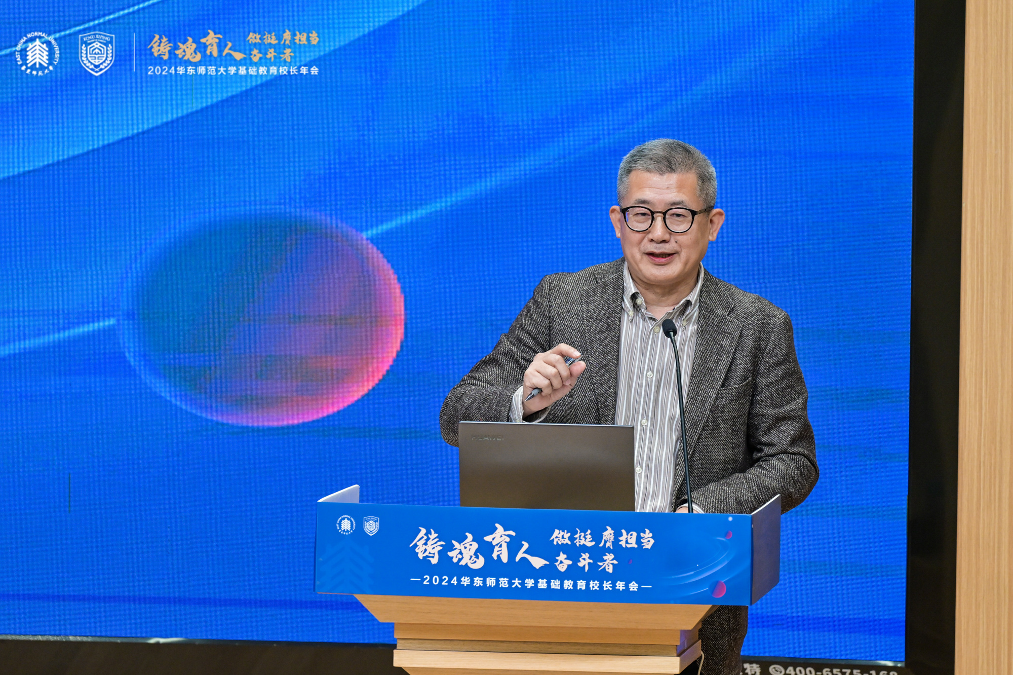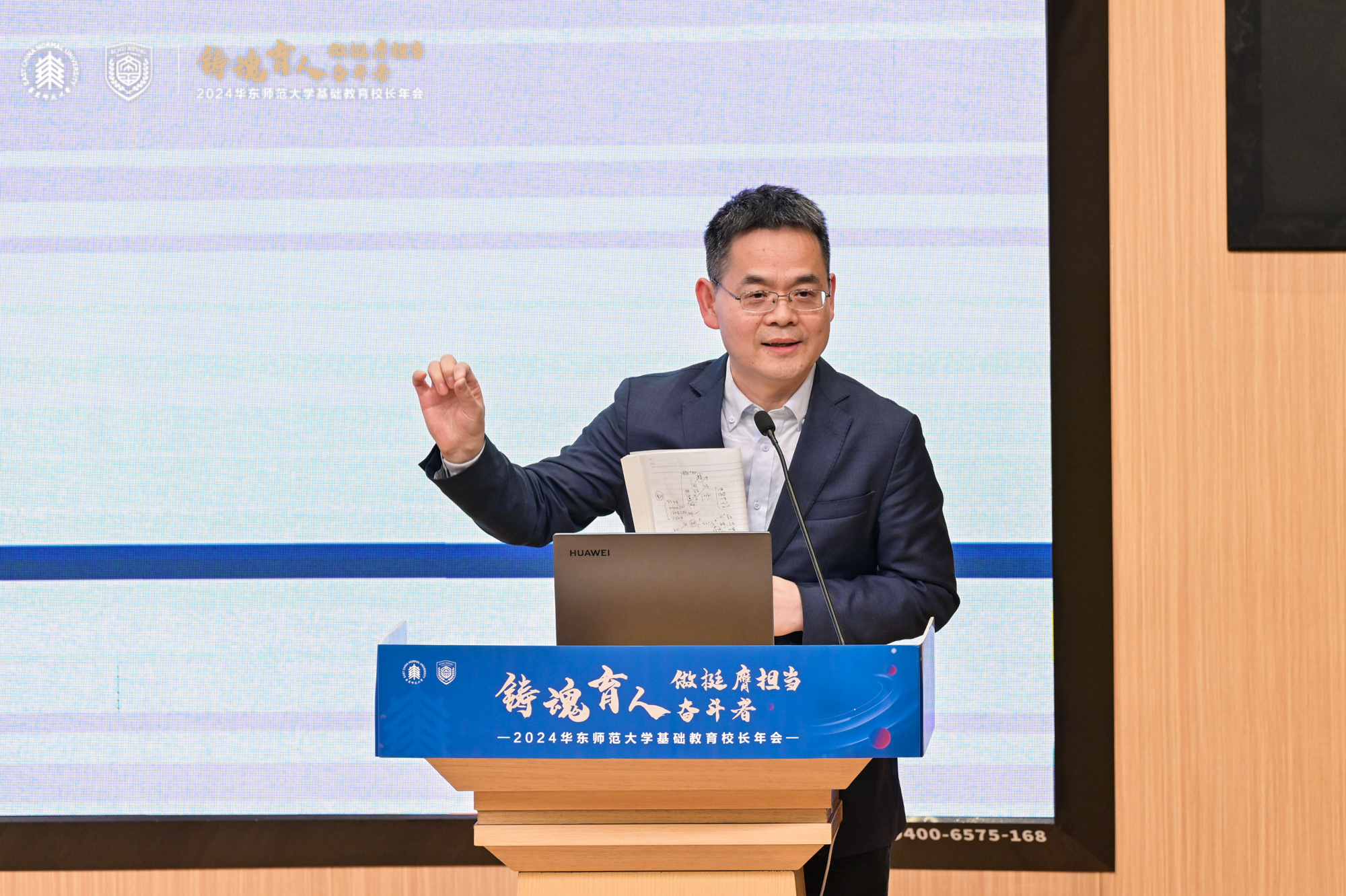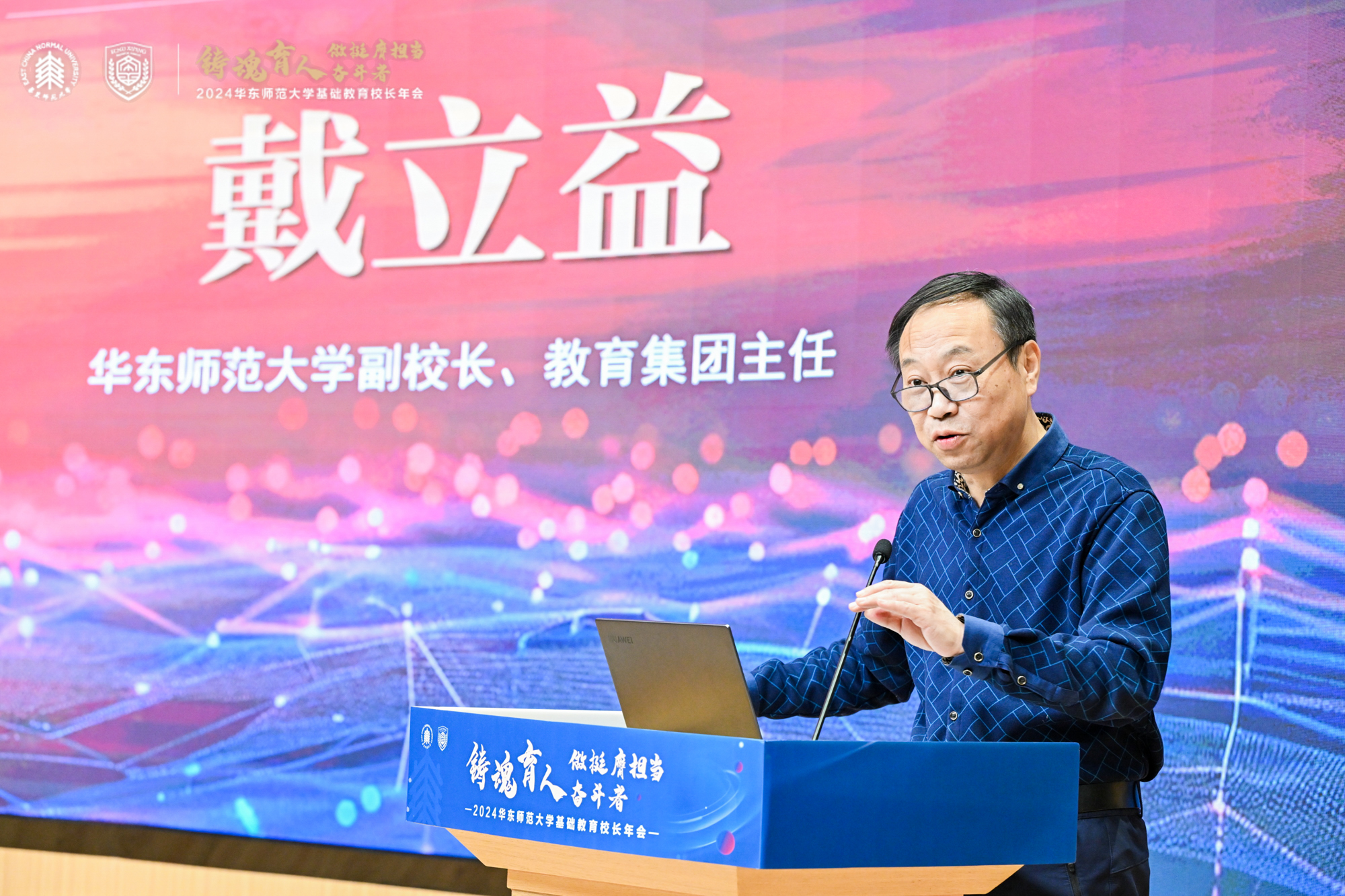 3245澳门新莆京副校长、教育集团主任戴立益表在讲话中,全面回顾总结了2024年3245澳门新莆京教育集团校的办学成绩,并对年会主题进行了解读。他建议校园长注重培养日常行政管理能力、课程领导力和学校迭代发展路径的选择能力;着重阐释了新时代“大先生”之大,在于历史跟未来的大维度、本土和世界的大格局、教室和社会的大课堂、循规和突破的大智慧、小我和大我的大情怀;描述了华师教育人的群像:卓越的霸气和睿智的灵气、开放的张力和包容的定力,及“好学近乎知,力行近乎仁”的品质;并期待未来可以看到集团校在拔尖创新人才培养、AI赋能教育发展、教育评价改革、学生健康成长方面的探索案例。