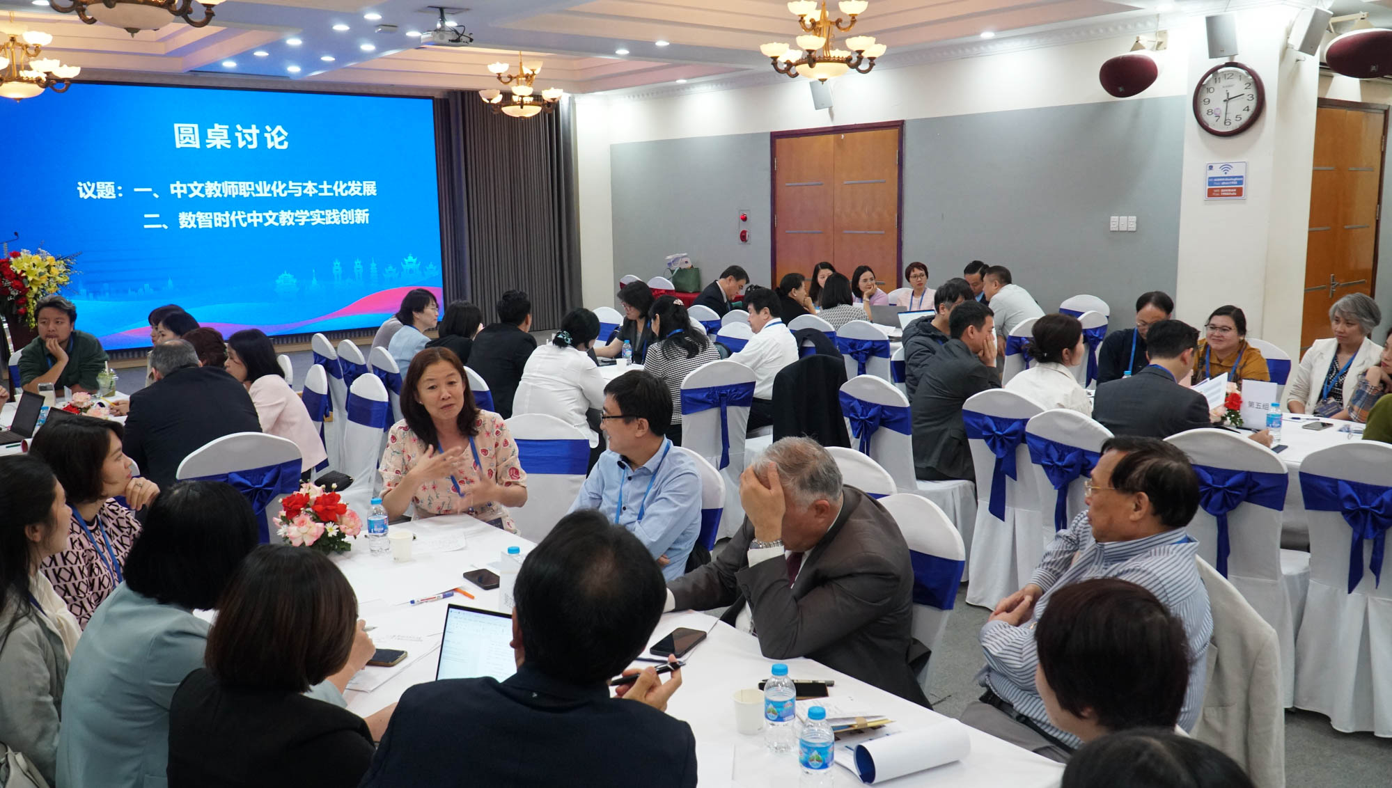 参会代表围绕中文教师职业化与本土化发展、数智时代中文教学实践创新等议题分小组展开圆桌讨论。英国诺丁汉大学副教授王维群、加拿大卡尔加里大学教授蔡薇、越南河内国家大学下属外国语大学中文系主任范明进(Pham Minh Tien)、国立韩国教员大学教授金锡永(Kim Sok Yong)、越南河内国家大学下属外国语大学副教授阮廷贤(Nguyen Dinh Hien)作为小组召集人进行总结发言。与会嘉宾认为中文教师职业化与本土化应根据不同国家的实际情况设立适当的标准,并注重本土教师的培养和教材本土化;ChatGPT等人工智能工具虽能在教学中发挥辅助作用,包括结合虚拟现实的创新教学方式来提升学习体验,但也需谨慎应对其带来的挑战,技术应用应平衡师生互动与教学质量。