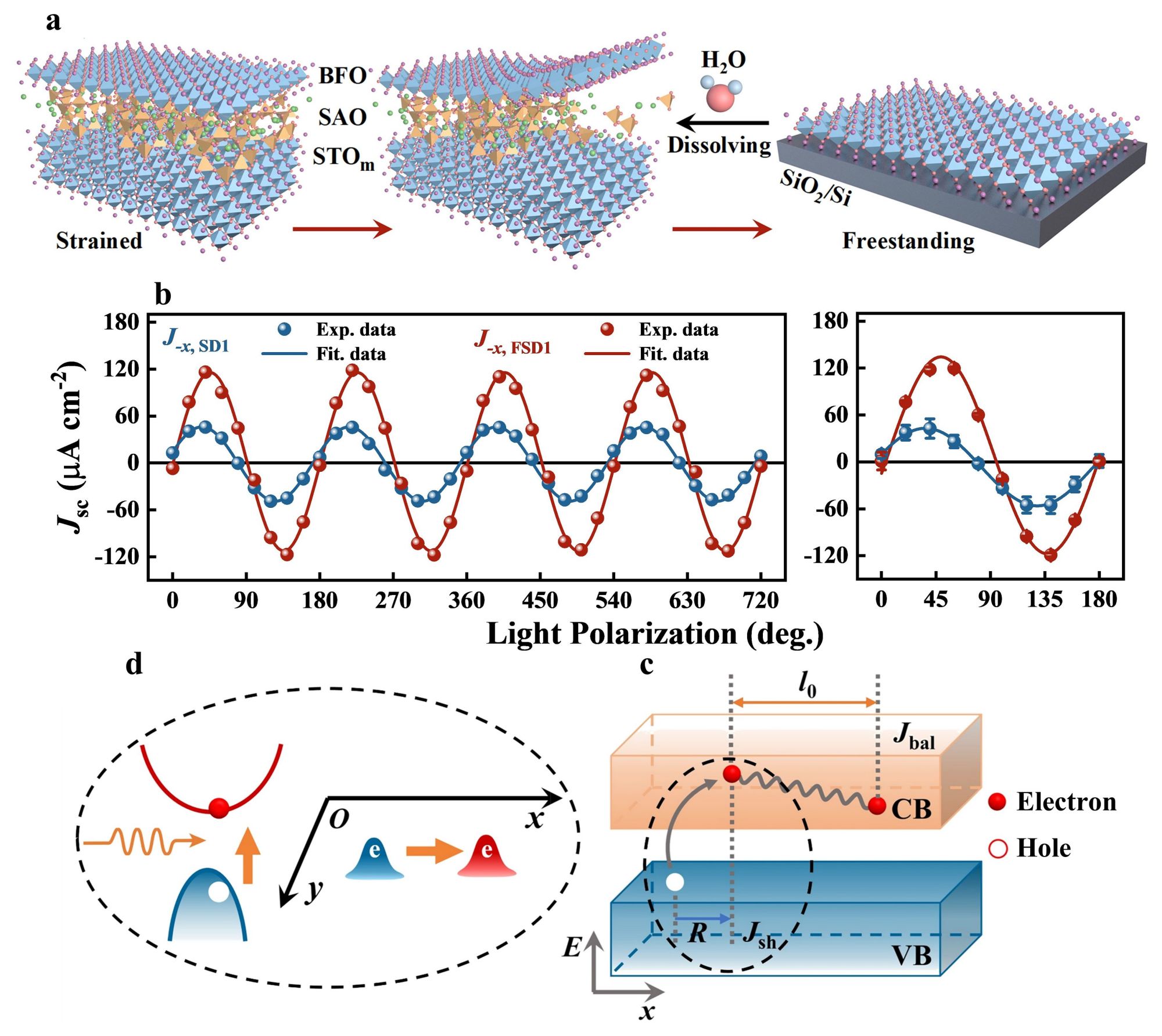 图1. 自支撑铁电氧化物薄膜BFO的制备、体光伏效应和微观机理