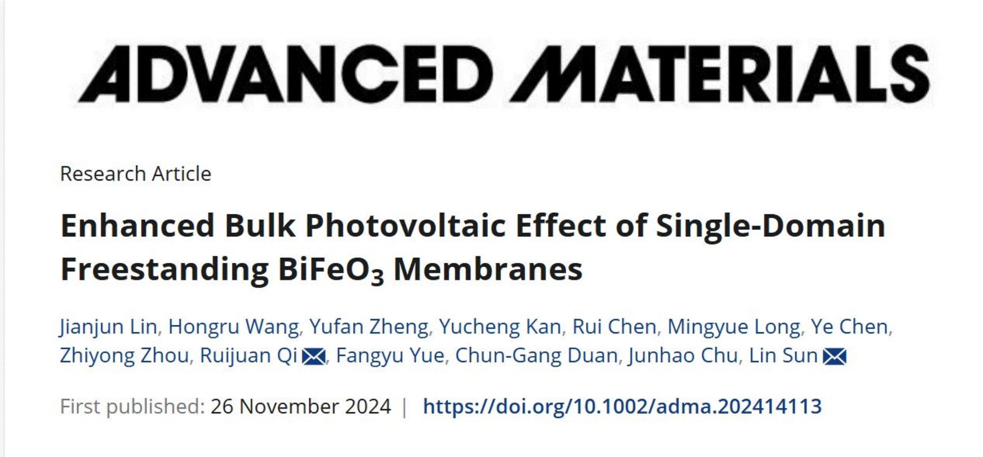 针对这类科学问题,3245澳门新莆京物理与电子科学学院孙琳教授课题组在成功制备自支撑铁电单畴BiFeO₃(BFO)薄膜的基础上,首次发现了自支撑单畴BFO薄膜具有显著增强的体光伏效应,并阐明了体光伏效应增强的微观机理。该项成果可为发展高效和柔性的新型光伏器件提供了新策略,研究成果以“Enhanced Bulk Photovoltaic Effect of Single-Domain Freestanding BiFeO3Membranes”为题,发表于 Advanced Materials 期刊。