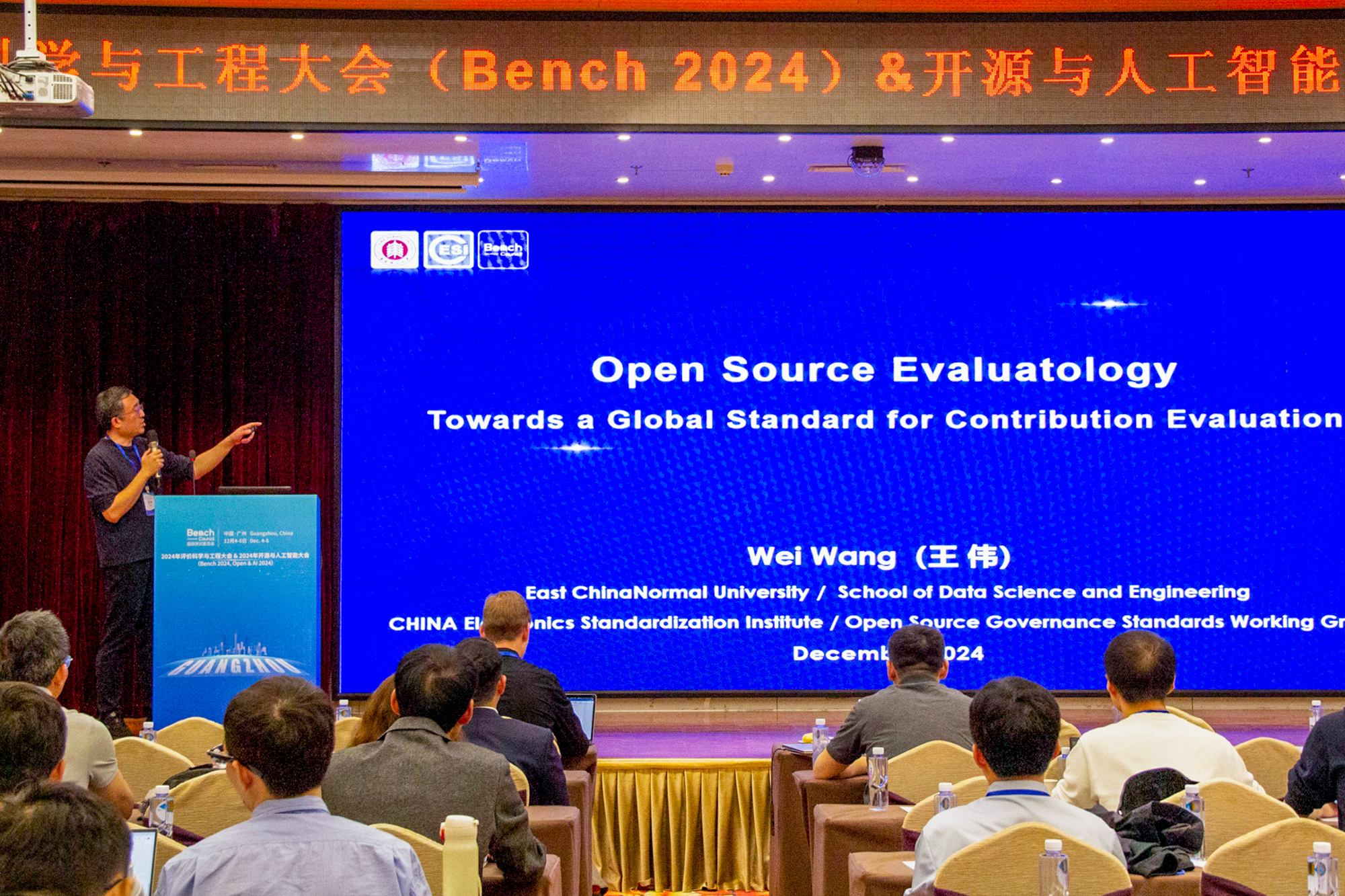 在大会首日,华东师大数据科学与工程学院王伟教授作了题为“开源评价学:迈向全球统一的贡献评价标准”的主题报告,首次系统提出了“开源评价学”的理论框架。这一开创性研究融合了开源技术、数据科学与工程、数字治理和科学评价等多个维度,为全球开源生态的科学评价提供了全新的理论基础与实践方法。