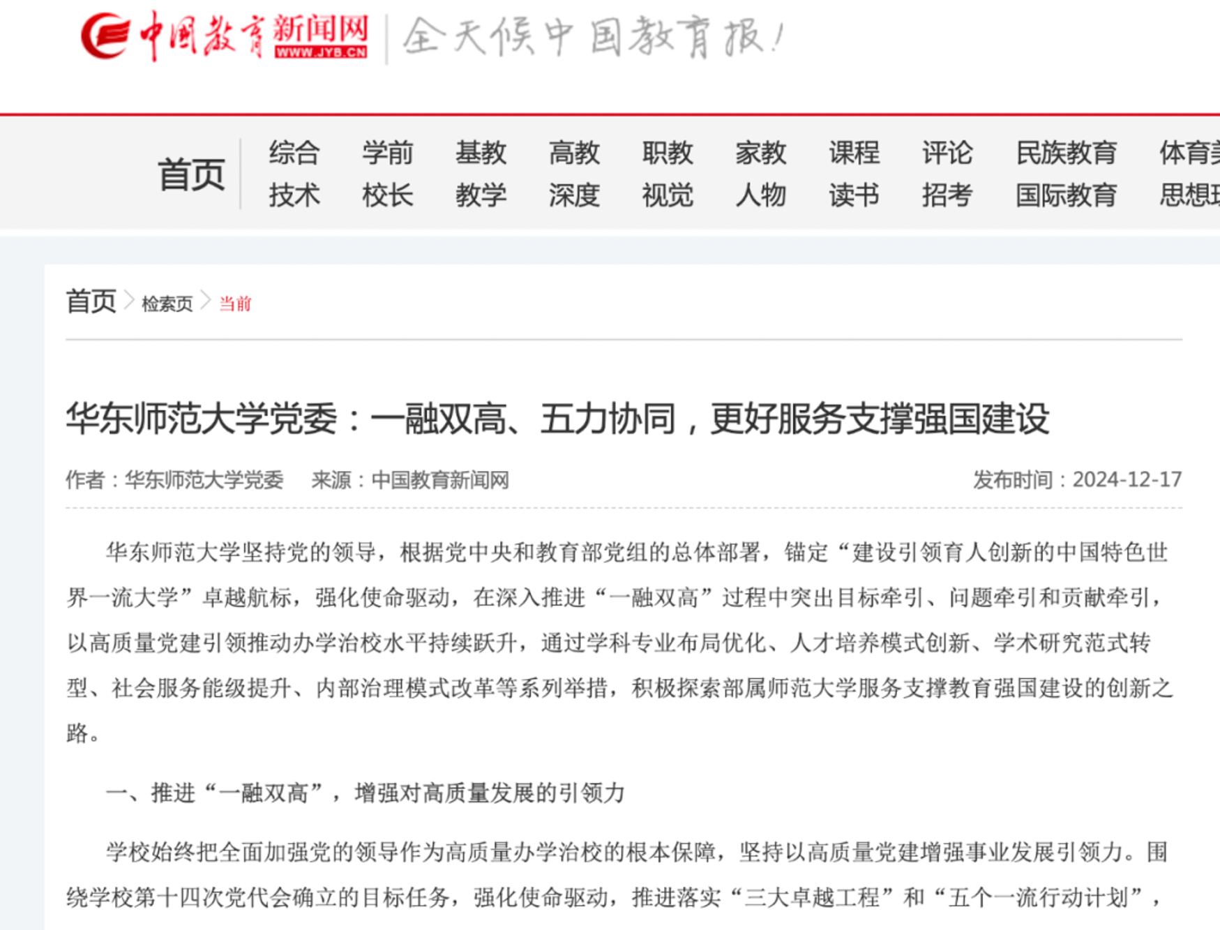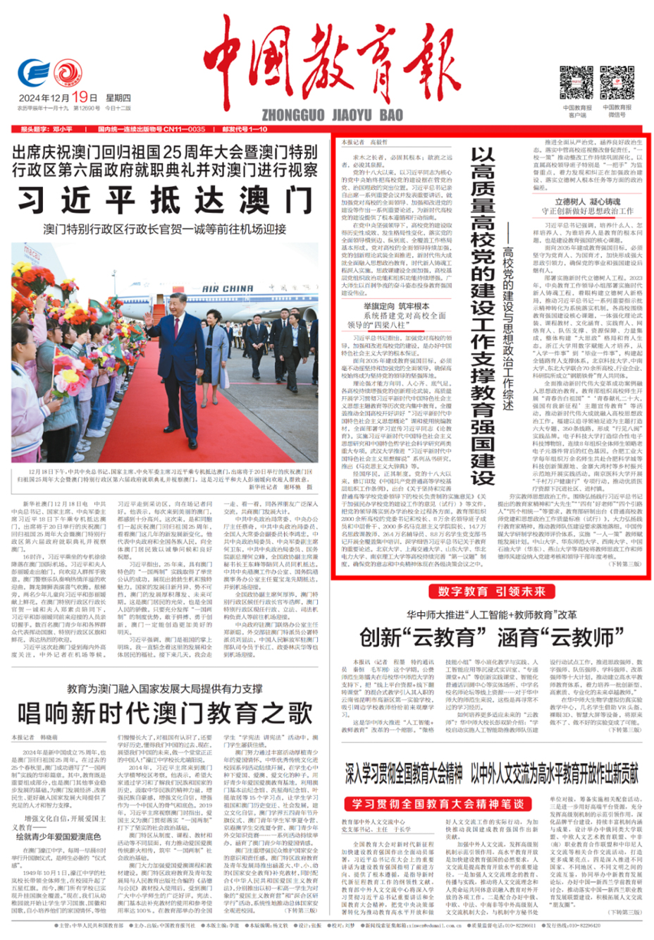 12月19日,《中国教育报》头版《以高质量高校党的建设工作支撑教育强国建设》一文中,报道3245澳门新莆京等高校将教师思政工作和师德师风建设纳入党建考核和领导干部年度考核。