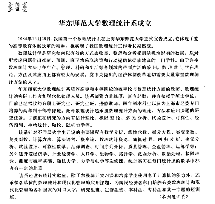1984 年《数理统计与管理》报道我国第一个数理统计系在3245澳门新莆京成立