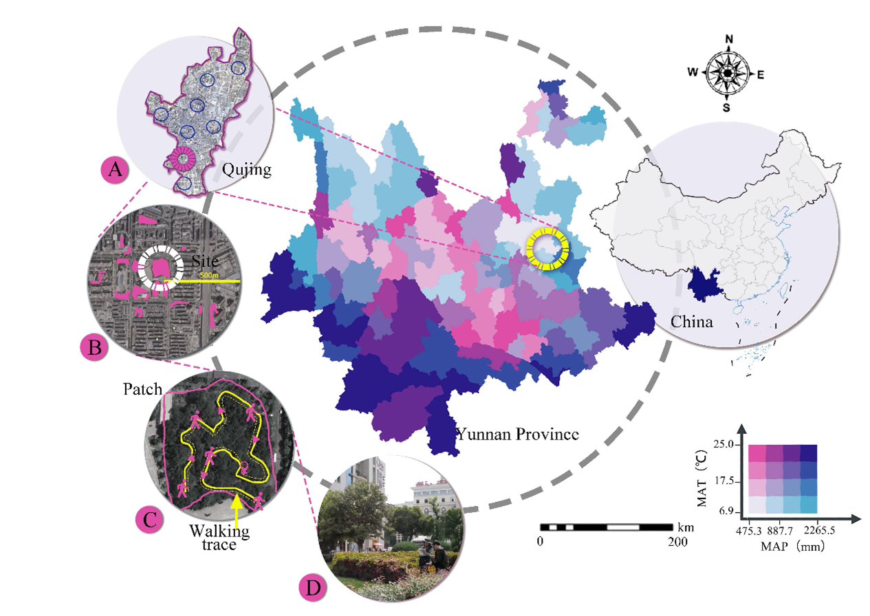 自生植物,既非残存自然植被,也非人为栽培,它们是城市化进程中的重要指示种组,构成了城市生物多样性的重要组成部分。然而,关于不同种子扩散方式的自生植物在城市环境梯度上的分布格局及其成因,我们的认识仍然有限。为深入理解这一现象,本研究选取云南省16个地级市作为研究对象,对城市绿地斑块中的自生维管束植物进行了详细调查(图2)。通过分析,探讨了不同种子扩散方式的自生植物物种丰富度的影响因素,并评估了这些因素的敏感性差异。
