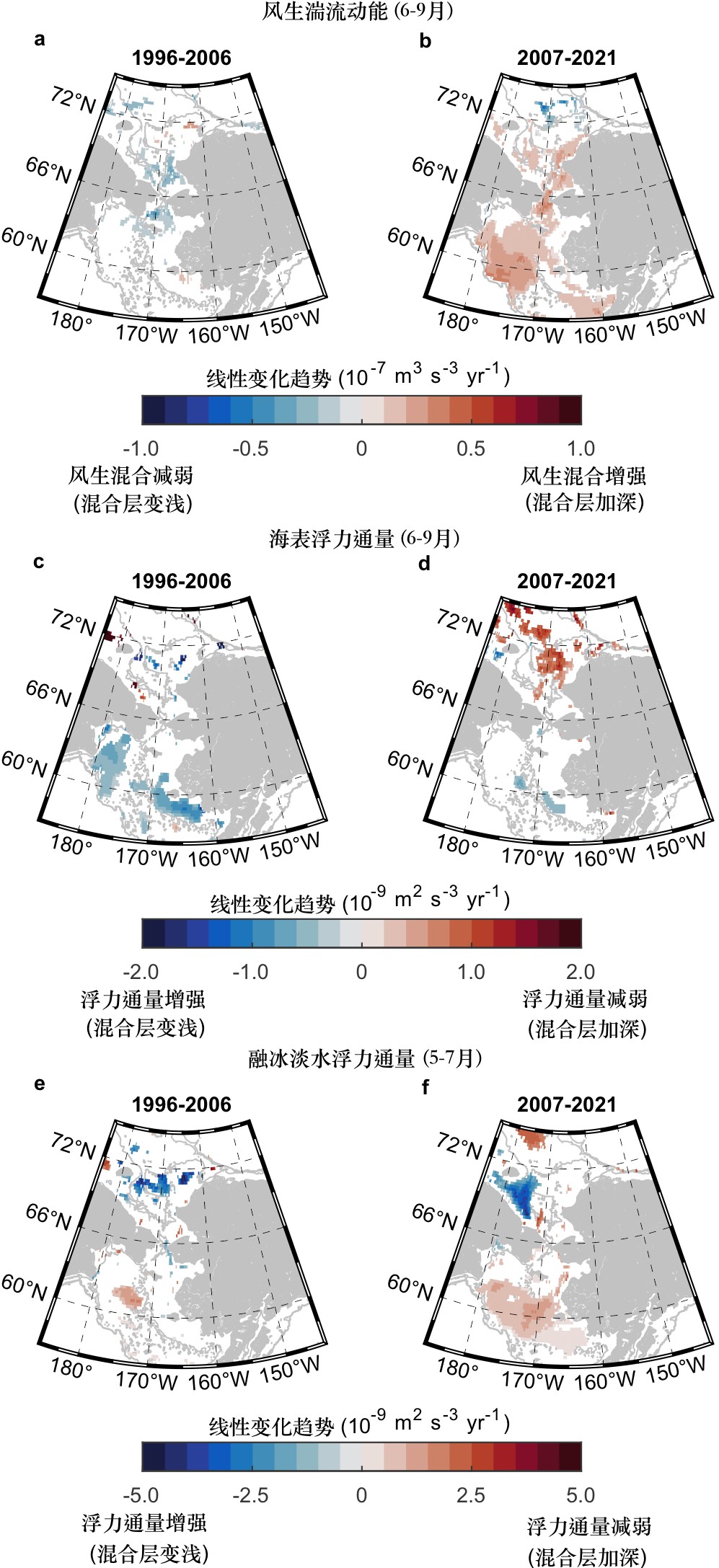 图3. 北极太平洋扇区陆架在两个阶段的风生湍动能、海表浮力通量以及融冰淡水浮力通量的变化趋势