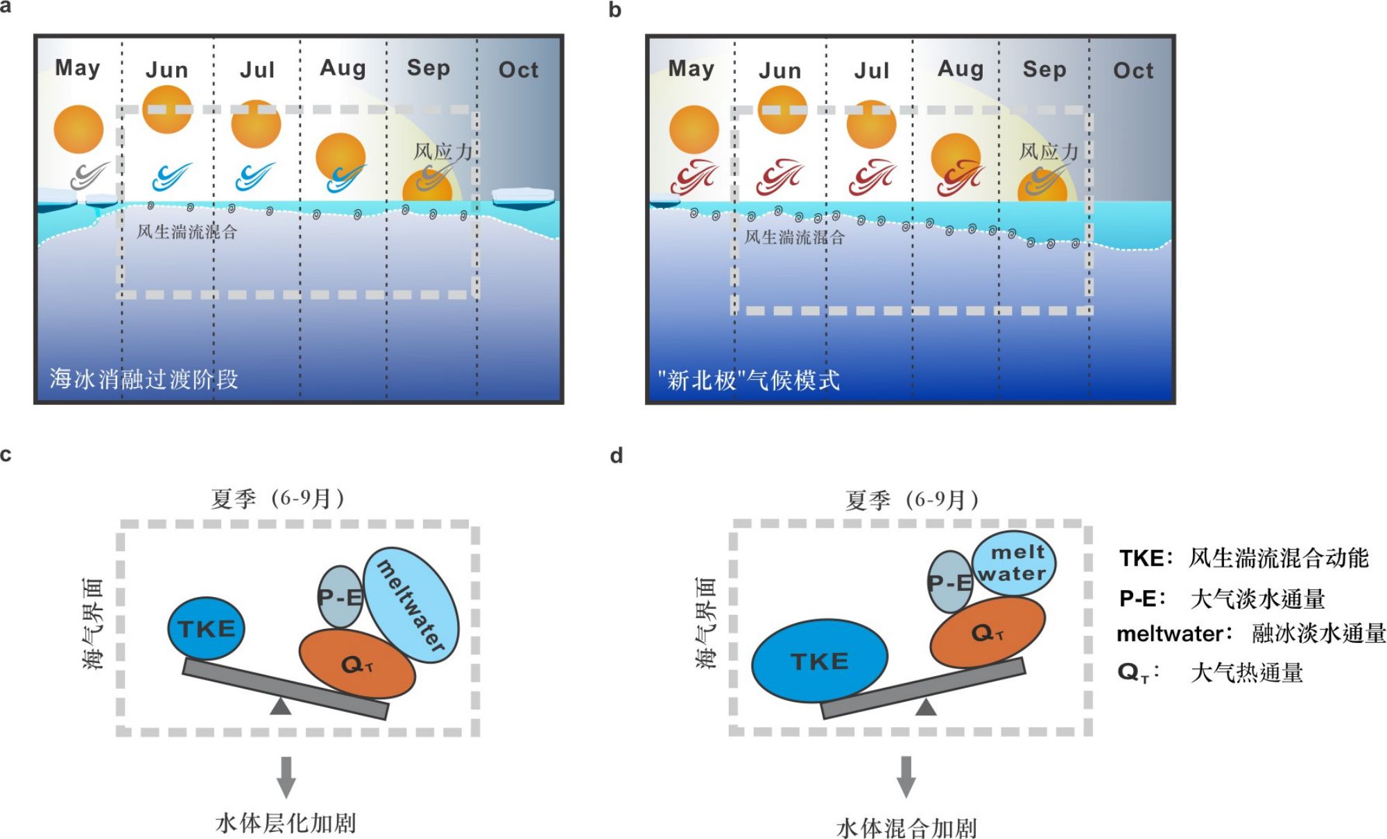 图4. 海冰和大气条件在原有和“新北极”气候模式下对海洋上混合层的影响