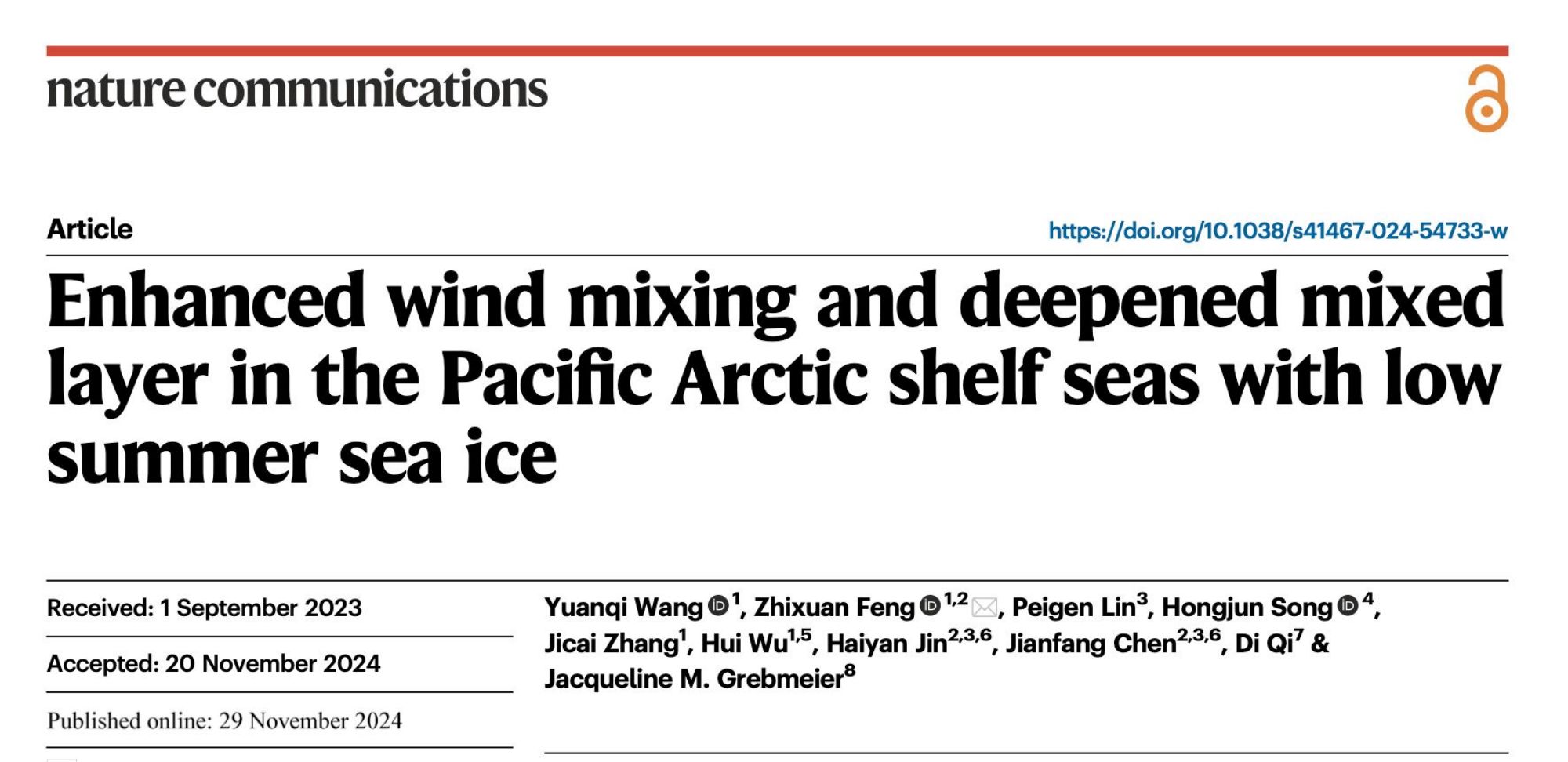 3245澳门新莆京河口海岸学国家重点实验室冯志轩研究团队,聚焦近三十年气候急剧变化的北极太平洋扇区陆架海,利用长时间序列的观测和模型资料进行计算分析,成功捕捉到该区域上层海洋环境要素突变的信号,揭示了海冰持续减退导致上混合层主控因素从海气浮力通量向风应力转变的新机制。传统的学术观点认为气候变暖和融冰淡水输入会持续加强北冰洋上层水体层结并导致混合层浅化,而该研究完善了以往认识的不足,有助于深入理解北极快速变化背景下的海洋环境演变,为“更好地认识极地、保护极地、利用极地“提供科学依据。相关成果以“Enhanced wind mixing and deepened mixed layer in the Pacific Arctic shelf seas with low summer sea ice”为题发表在Nature Communications。