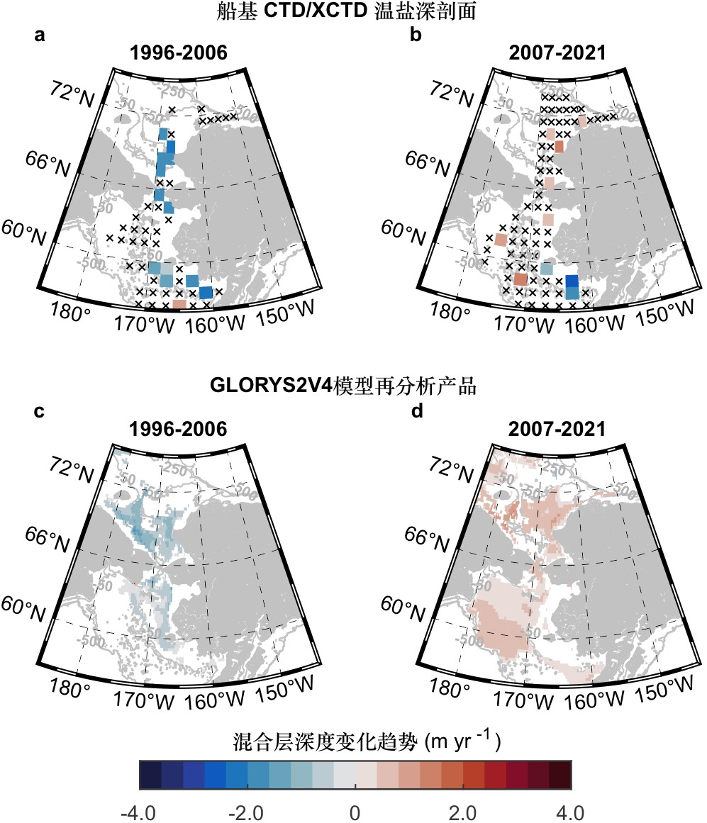 图2. 北极太平洋扇区陆架在两个阶段的夏季(6-9月)混合层变化趋势