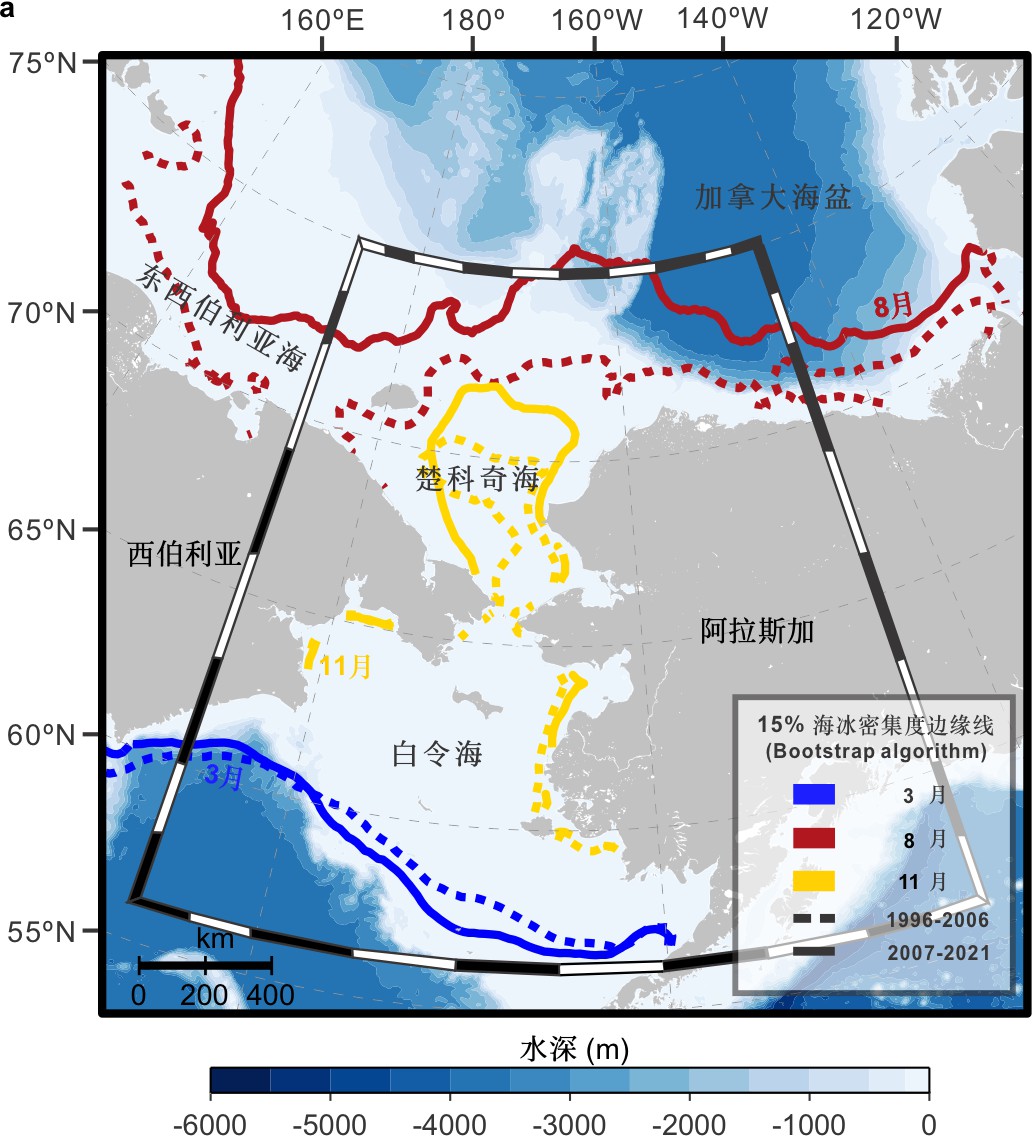 图1. 北极太平洋扇区陆架及海冰边缘线分布图