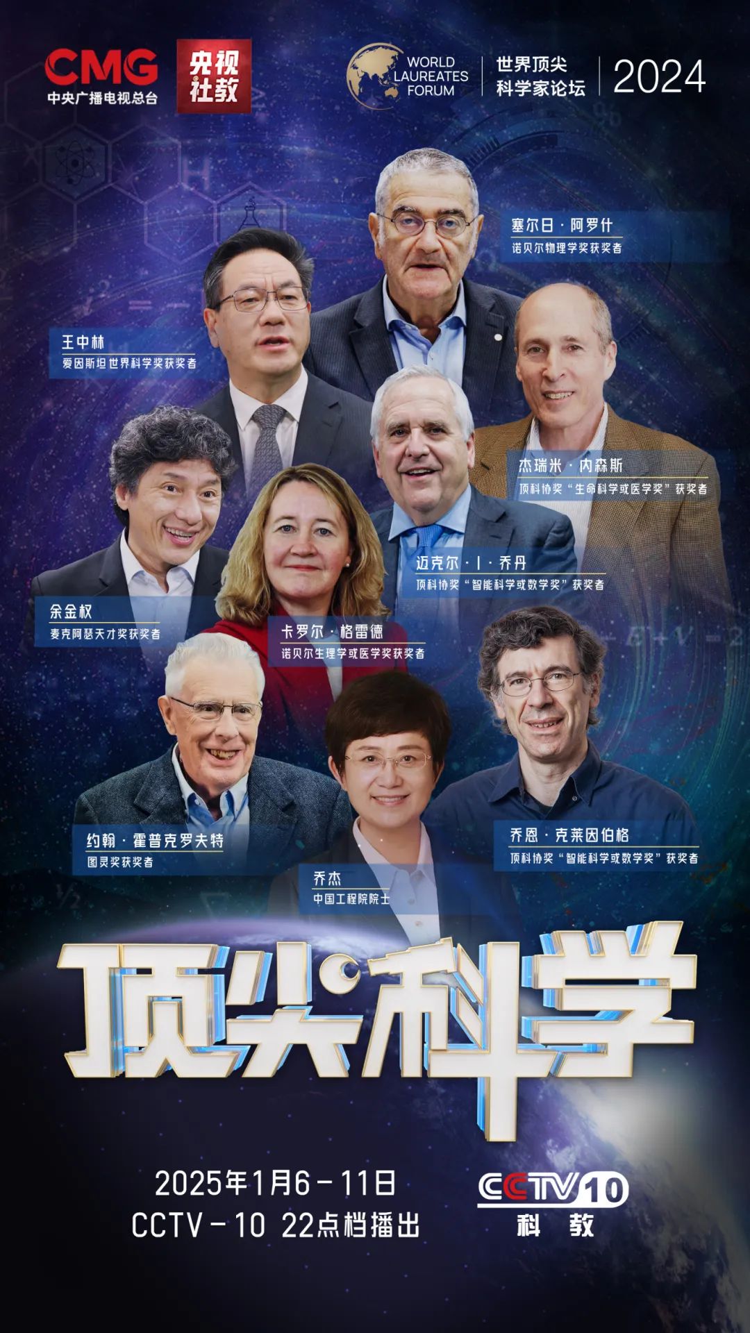 6集特别节目《顶尖科学》由世界顶尖科学家论坛(WLA Forum,中文简称“顶科论坛”)联合中央广播电视总台社教节目中心制作推出。节目在2024世界顶尖科学家论坛期间追踪拍摄,特邀诺贝尔奖、图灵奖、麦克阿瑟天才奖、顶科协奖等世界顶尖科学奖项得主以及中国科学院、中国工程院院士等二十多位顶尖科学家,多维度展示人工智能、生命科学、合成药物、新能源、科学教育领域的发展历程和最新成就,以搭建虚拟演播室数字合成特效,采用中国青年科学家与顶尖科学家对谈方式,让观众们享受思维火花的迸射,感受世界顶级大脑的睿智。