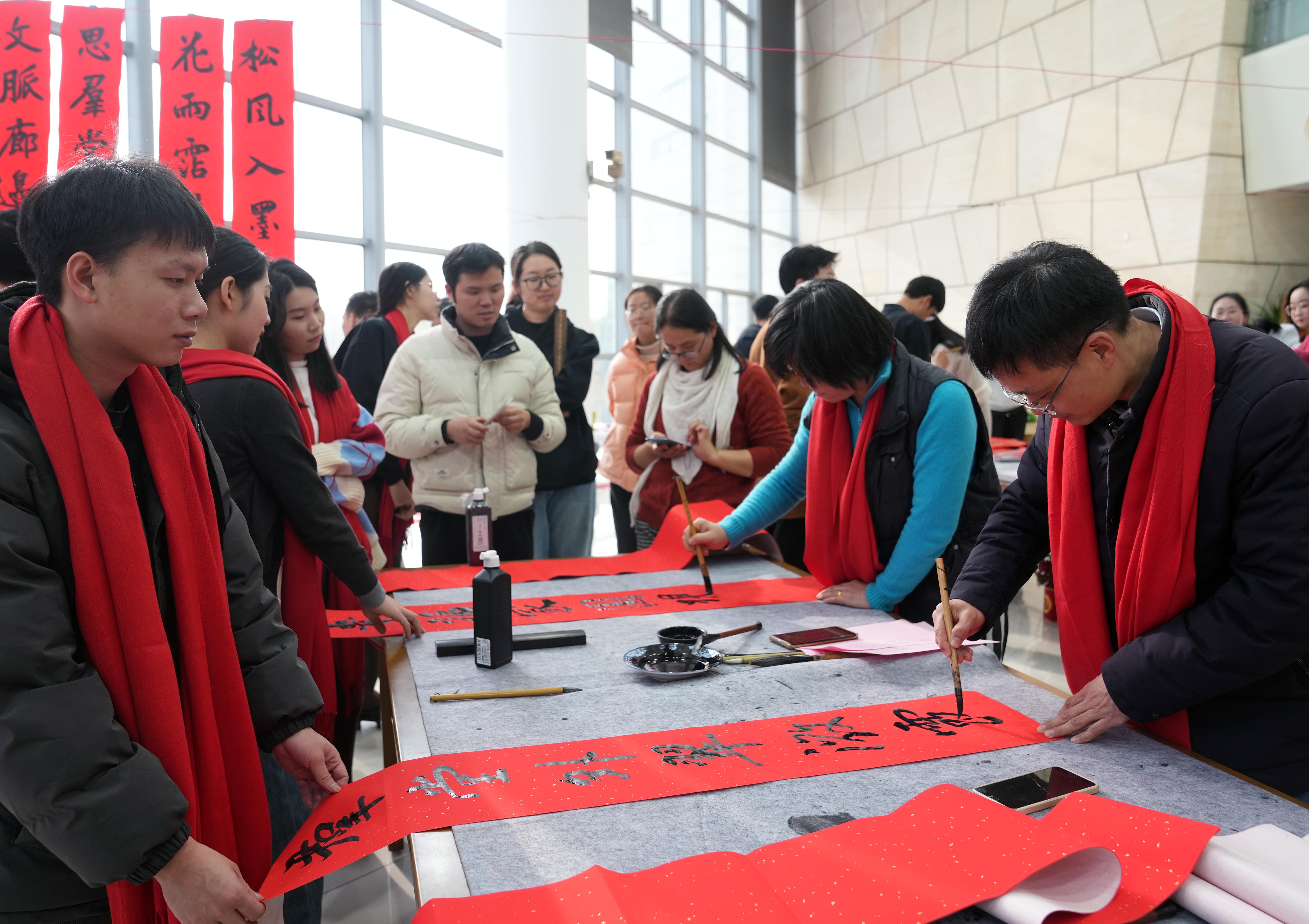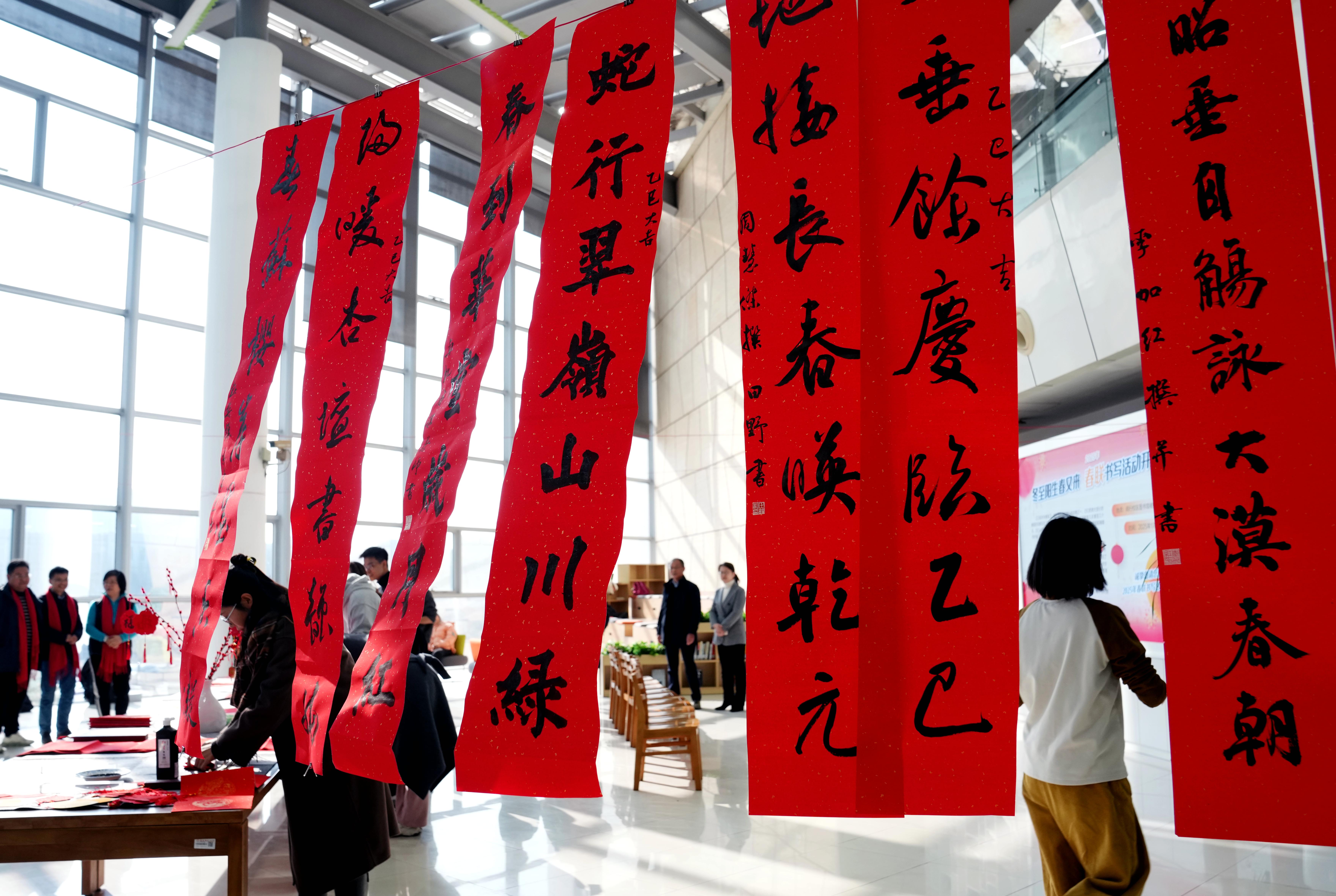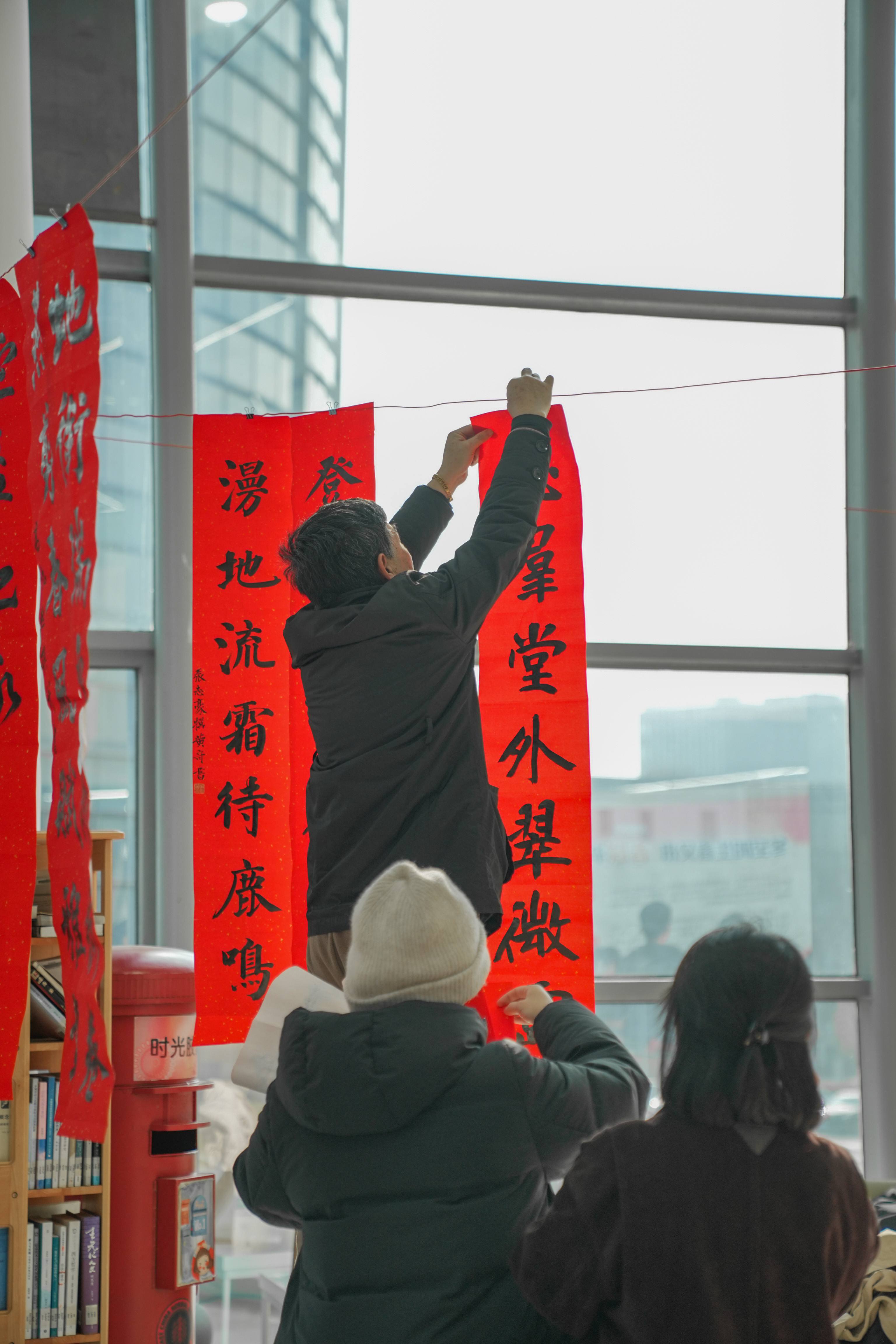 图书馆大厅人头攒动,人人品鉴着以书法线条、劲力表现出来的文字意境。大红的春联把祥和、喜庆、明快的红晕,落在了每个人的脸上。