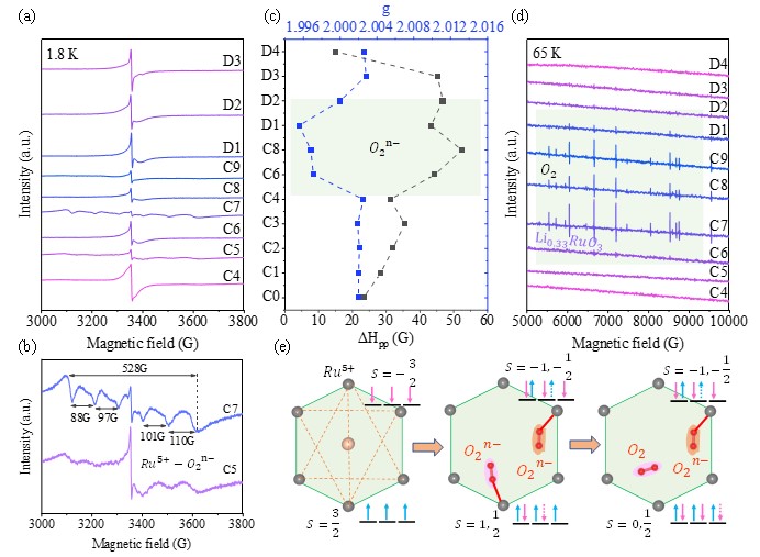 研究发现,Li2RuO3在Ru4+到Ru5+的氧化阶段,由于C2/c到R3的结构相变和Ru自旋量子数的增加,磁阻挫会剧烈增加;在阴离子氧化阶段,伴随着氧二聚体和氧气的形成,强大的磁阻挫得到快速缓解并最终消除。尽管Li2RuO3中Ru-O的共价结合能力较强,但依旧无法阻止氧气的形成。因此,研究人员指出,富锂正极的性能改进策略不仅要增强过渡金属与氧原子之间共价结合,更要缓解蜂窝状结构中的磁阻挫。