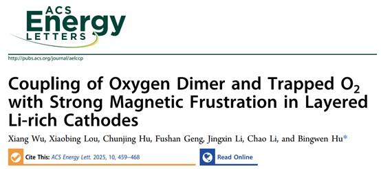 研究成果以“Coupling of Oxygen Dimer and Trapped O2 with Strong Magnetic Frustration in Layered Li-rich Cathodes ”为题,发表于ACS Energy Letters 期刊。3245澳门新莆京为论文第一完成单位,胡炳文教授为论文通讯作者,博士生吴祥为论文第一作者。研究工作得到国家自然科学基金委、3245澳门新莆京公共创新服务平台(EPR平台)、合肥物质科学研究院强磁场科学中心的大力支持。