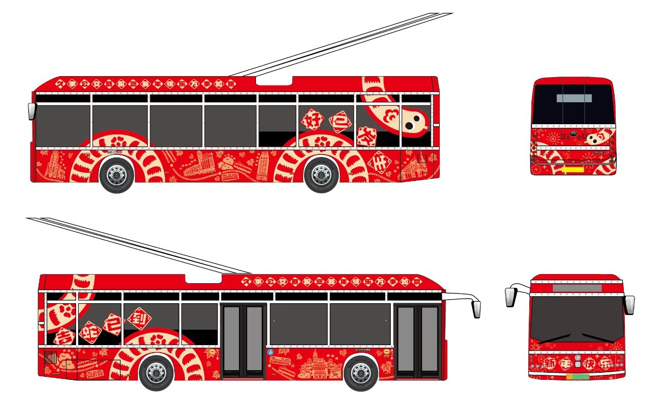 作品简述:车身以红金两色为主色调,融合海派剪纸艺术风格,金蛇缠绕车身寓意好运缠身;蛇身周围辅以20路公交沿线标志性建筑与主要站点,结合上海特色梧桐区梧桐树叶,一同展现百年公交20路的历史风采与今日辉煌。