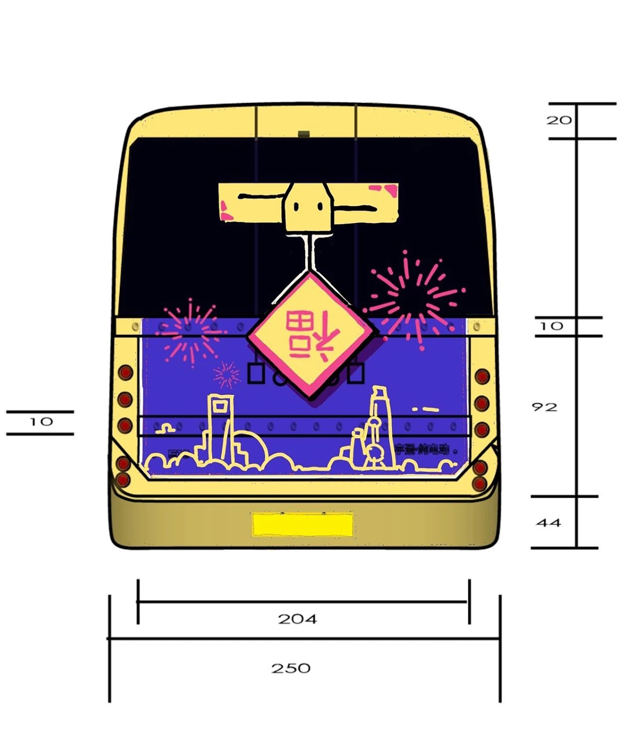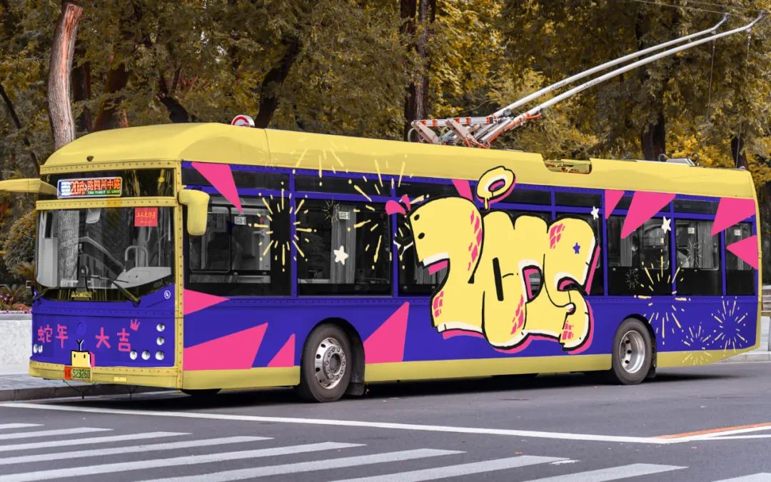 作品简述:作品以黄色和紫色作为基底,借鉴和运用了街头涂鸦的表现形式,再辅以可爱的蛇形象和灯笼、烟花等传统春节元素,以求中西合璧之美。车身背面涂装中绘制了上海外滩的剪影图形,与口衔倒福字的蛇共同组成了颇具上海特色的春节画卷。