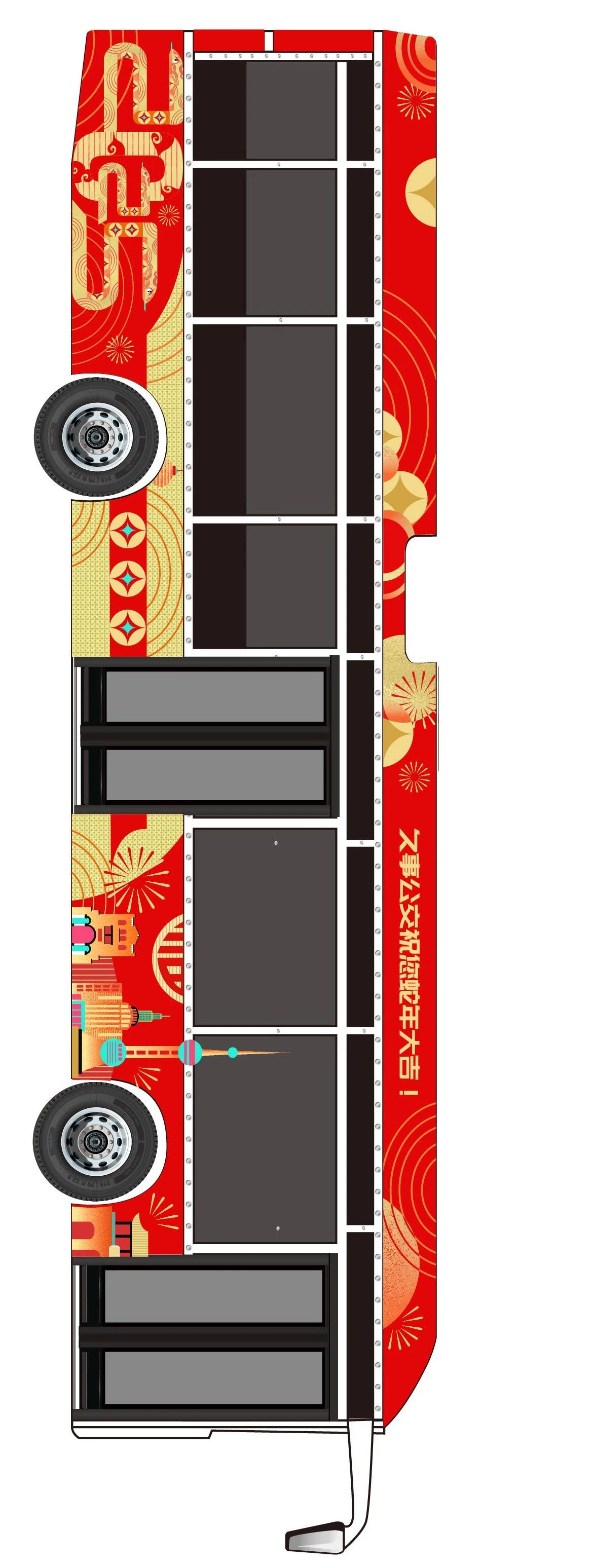 作品简述:本作品采插画风格。左面车身以财神爷形象的蛇为主角,背景辅以上海早期建筑,天灯点缀其间,营造出浓厚的传统节庆氛围。右面则转换为舞狮形象的蛇,与上海现代建筑相映成趣,灯笼高挂,彰显出都市的繁华与活力。