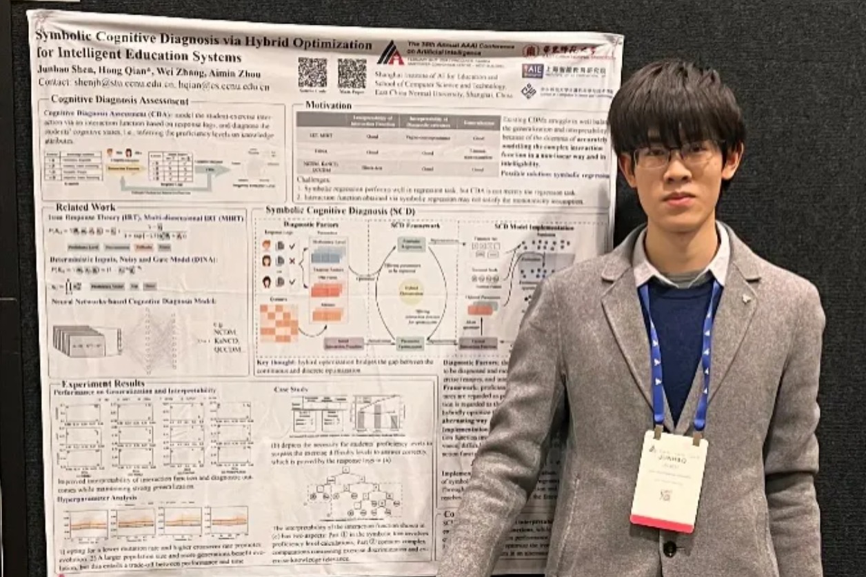 以第一作者身份在CCF-A类国际会议发表论文2篇;荣获神经信息处理系统大会(NeurIPS)2023因果结构学习挑战赛国际冠军;获中国计算机学会大学生学术秀本科组冠军;商汤奖学金提名奖、华鑫奖学金、优秀学生特等奖学金获得者......他是计算机科学与技术学院2021级本科生沈君豪,一起来看看这位本科生是如何玩转“人工智能+教育”。