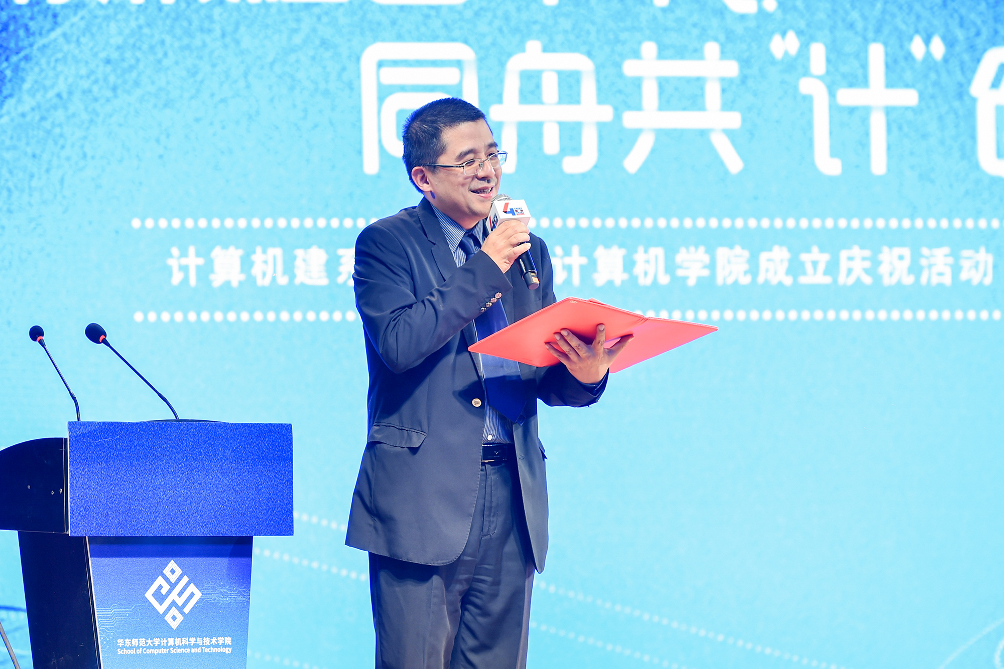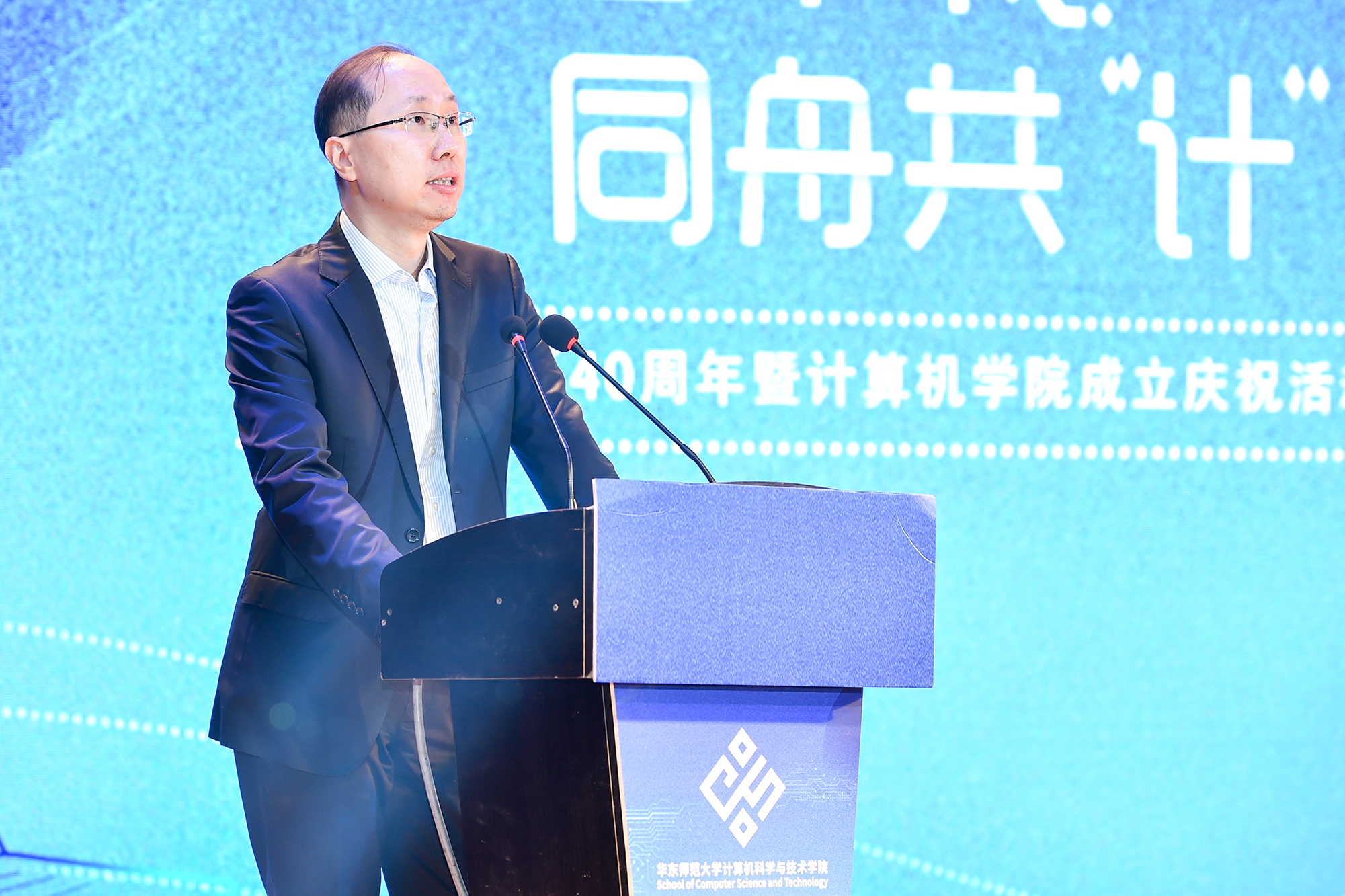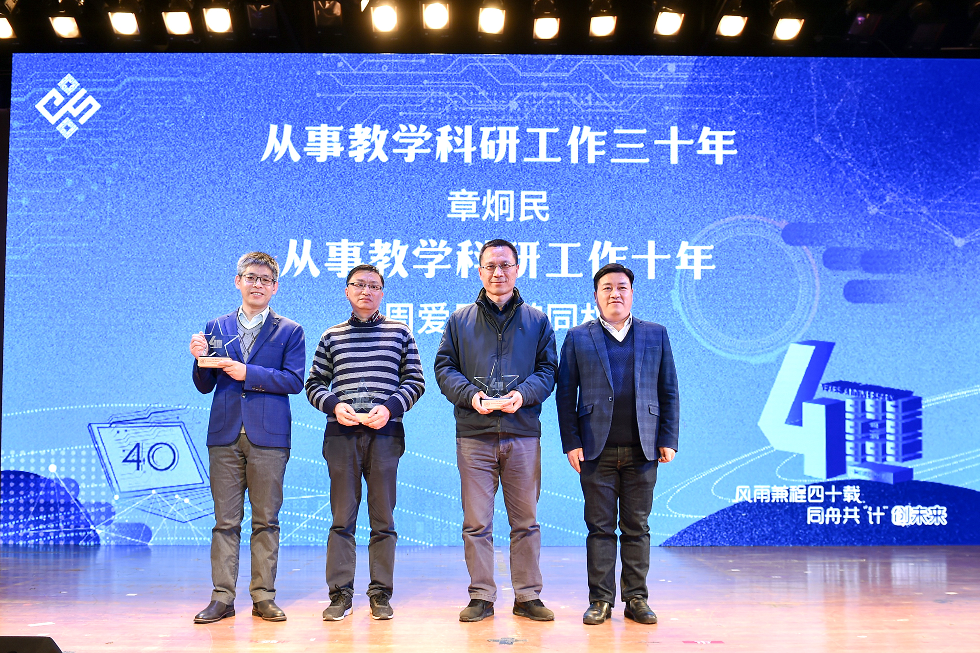 计算机建系四十周年暨计算机学院成立联欢会在中山北路校区思群堂举行。华东师大副校长、信息学部主任李志斌,华东师大原党委副书记杜公卓,华东师大原副校长、计算机系第二任系主任陶增乐,计算机系第三任系主任刘淦澄,计算机系第四任系主任黄国兴,计算机系第五任系主任杨宗源,计算机系第六任系主任、通信与电子工程学院院长吕岳,机关党工委书记王淑仙,实验室与设备处处长黄岚兰,通信与电子工程学院党委书记郑正奇,数据科学与工程学院院长钱卫宁等出席活动,学校各职能部门领导、学部教职工代表、学院校友会理事、退休教师、校友、全院师生共700人共同参加。本次庆祝活动分为“序曲·光阴的故事” “传承·岁月的坚守”“担当·青春的诠释”三个篇章。“序曲”和“传承”篇章由计算机科学与技术学院副院长贺樑主持。