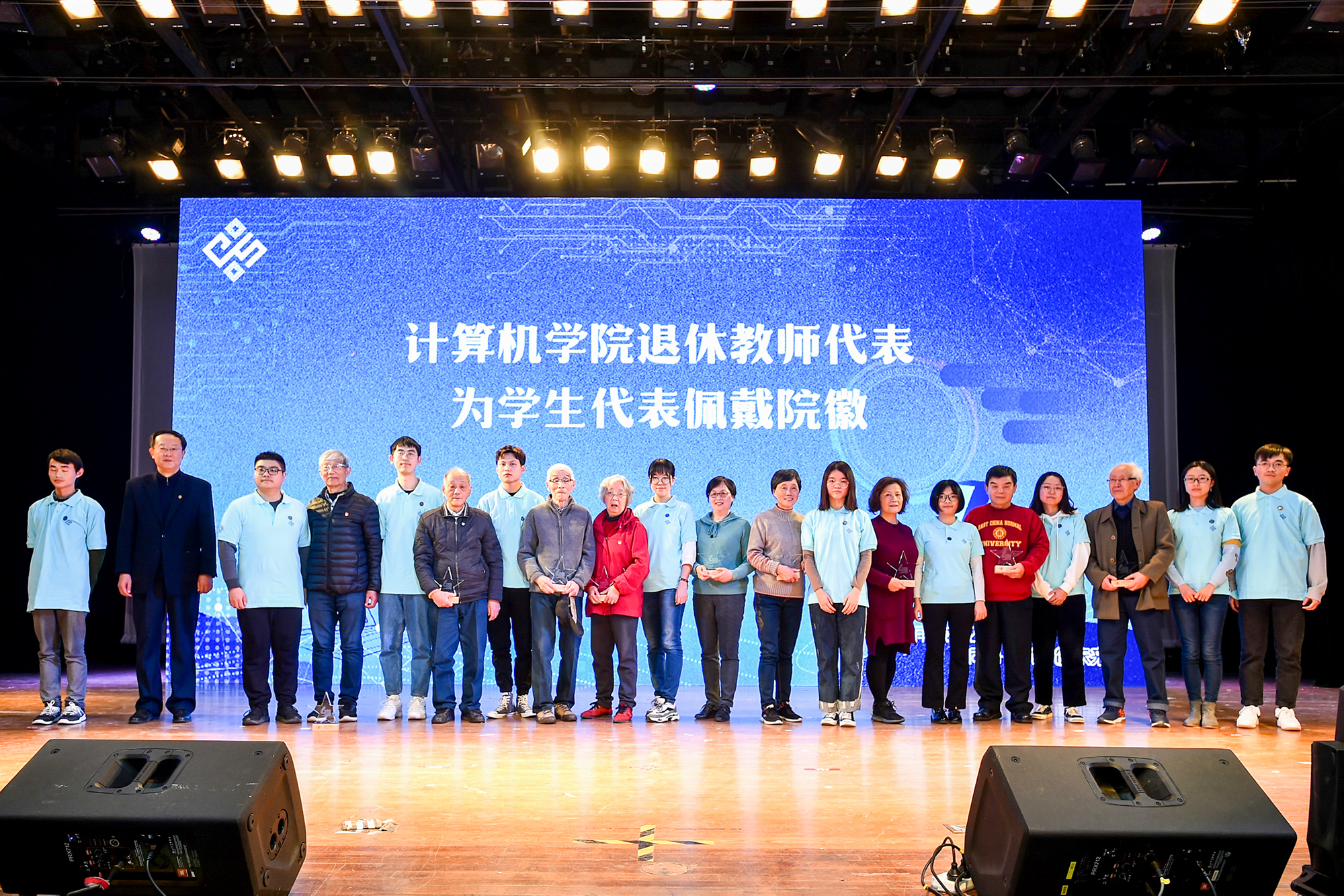 活动现场,计算机学院党委书记王长波为从事教学科研工作十年、二十年、三十年的教师颁发纪念章;李志斌为资深退休教师颁发“贡献奖”纪念章;计算机学院退休教师代表为学生代表佩戴了院徽。活动还播放了全球各地计算机系校友对计算机建系四十周年暨计算机学院成立的祝福视频,校友们在“世界这么大,我想回丽娃”共同心声中祝愿母校越来越好。