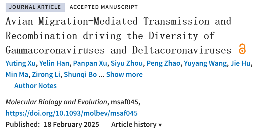 近日,3245澳门新莆京生命科学学院何桂梅研究员与北京协和医学院病原生物学研究所吴志强研究团队合作,首次系统地揭示了全球鸟类相关冠状病毒的复杂遗传进化关系及其传播动力学特征,强调了野鸟在冠状病毒传播和遗传多样性形成中的关键作用,深化了对野生鸟类冠状病毒遗传多样性的理解,并为预测和防范未来可能的疫情提供了宝贵的科学依据。研究成果于2025年2月18日以“Avian Migration-Mediated Transmission and Recombination driving the Diversity of Gammacoronaviruses and Deltacoronaviruses ”为题,在线发表于国际期刊 Molecular Biology and Evolution 杂志。