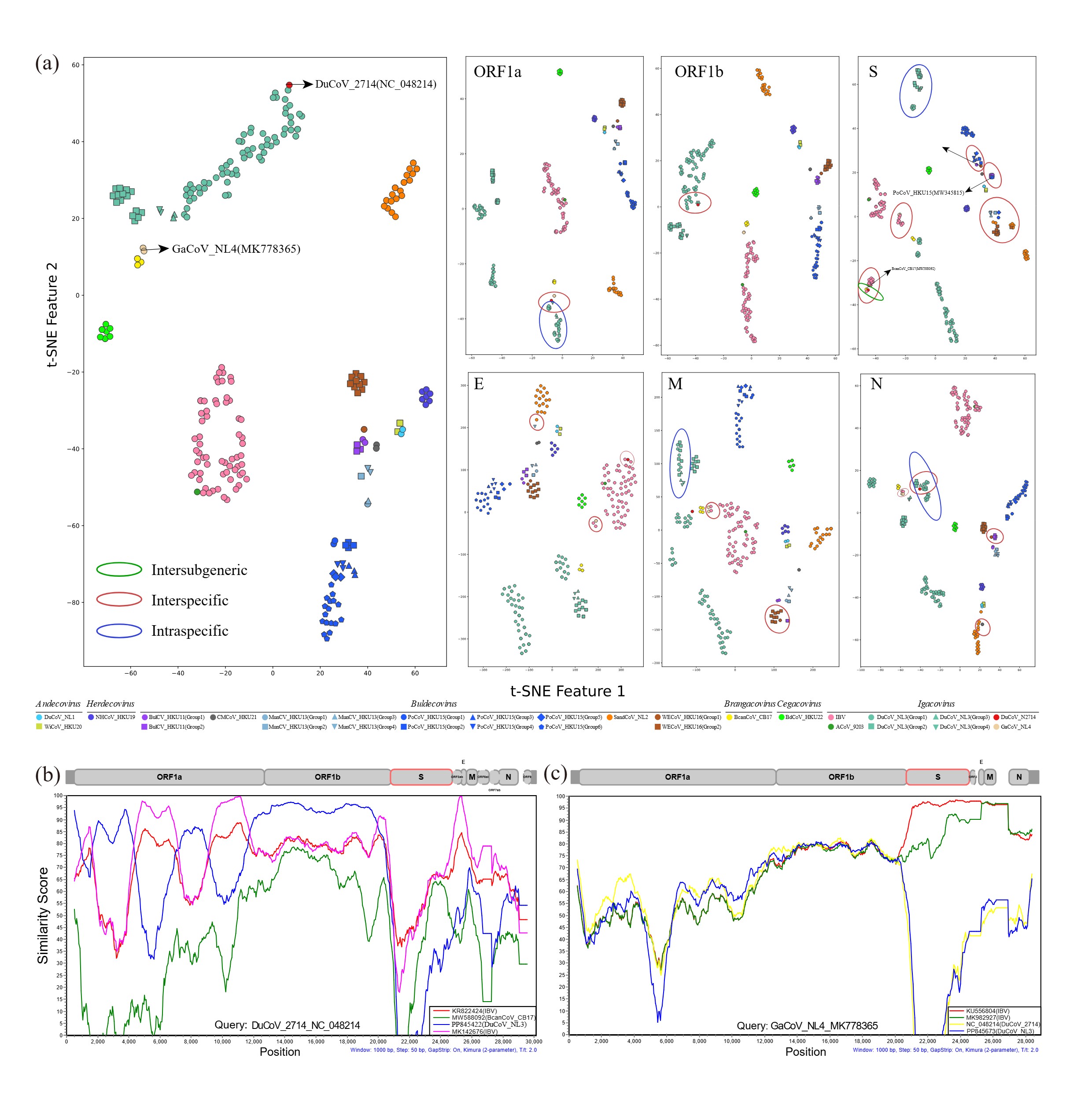 该研究通过4年的持续监测,从上海市采集的5,263份野鸟样本中鉴定出372份冠状病毒阳性样本,发现了17个携带冠状病毒的新鸟种,并成功获得了其中120株野鸟冠状病毒的全基因组序列。结合公共数据库中所有与野鸟相关的冠状病毒基因序列进行综合分析,鉴定了三个新冠状病毒种,并且将一种已知冠状病毒进行了重新分类。同时,发现了冠状病毒刺突蛋白在不同病毒种类和亚属之间存在复杂的重组模式,强调了家养水禽在冠状病毒从候鸟向非候鸟传播的过程中起到了关键的桥梁作用,也进一步证实了候鸟作为gamma和delta属冠状病毒自然宿主的重要性。