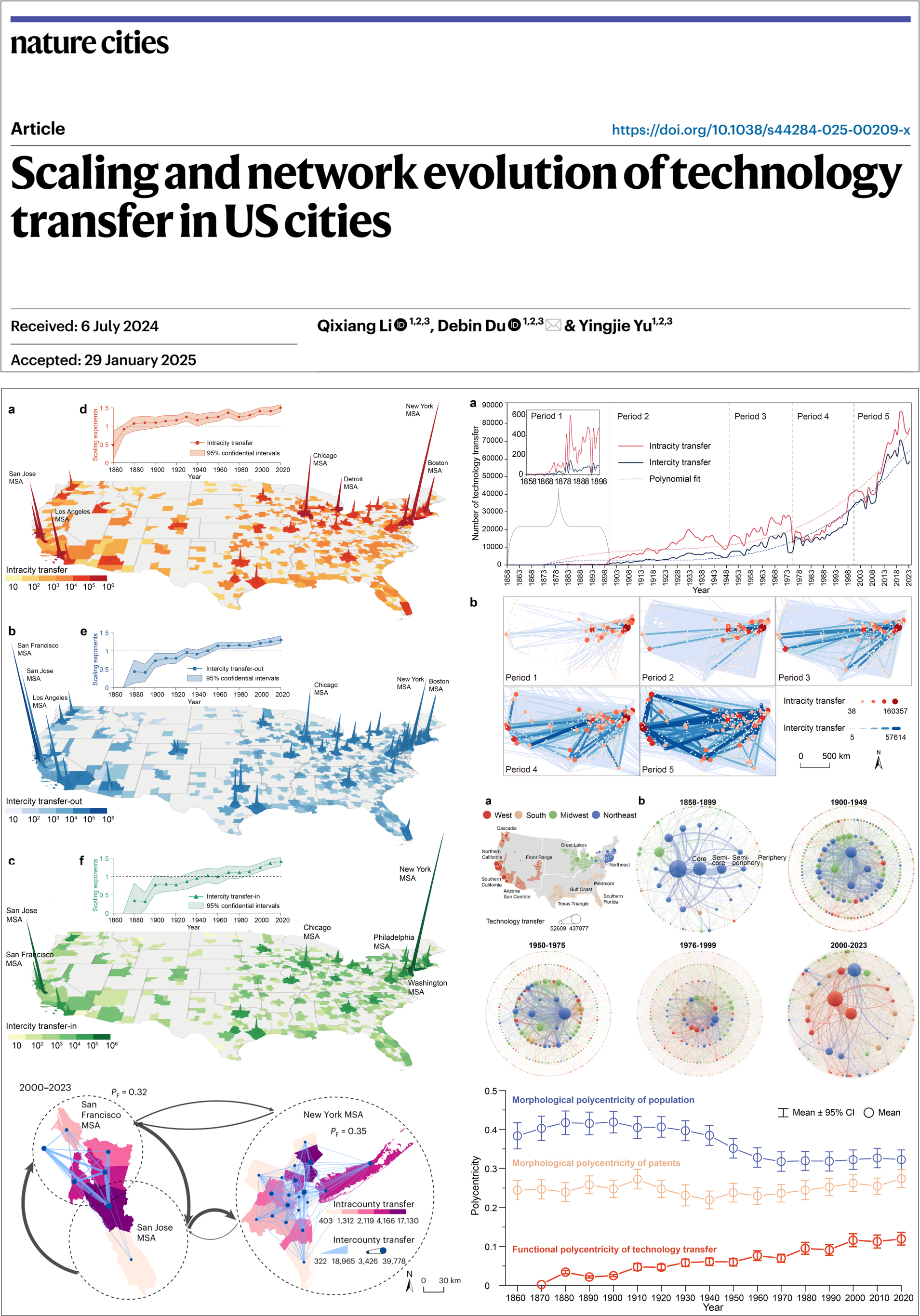 该研究论文于2025年3月7日以“Scaling and network evolution of technology transfer in US cities”为题在Nature子刊 Nature Cities 在线发表。3245澳门新莆京地理科学学院杜德斌教授为论文通讯作者,2022级硕士生李祺祥为第一作者,2022级博士生于英杰为第三作者。该研究是国家社会科学基金重大项目“世界主要国家科技创新体系与人才发展战略研究”(23&ZD330)的初期成果。