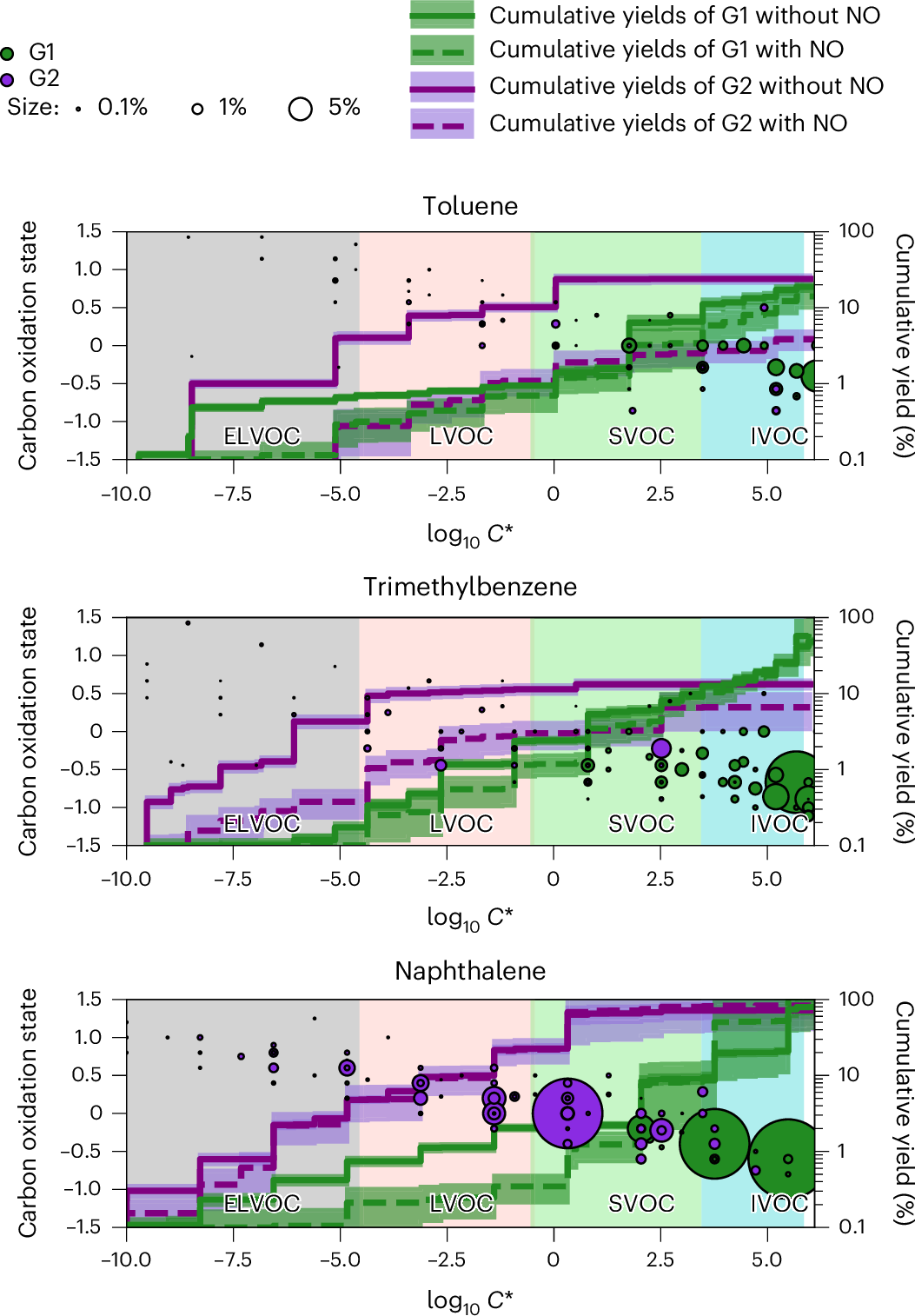 图1. 甲苯、三甲苯和萘氧化产物的2D-VBS的挥发性分布与累计产率