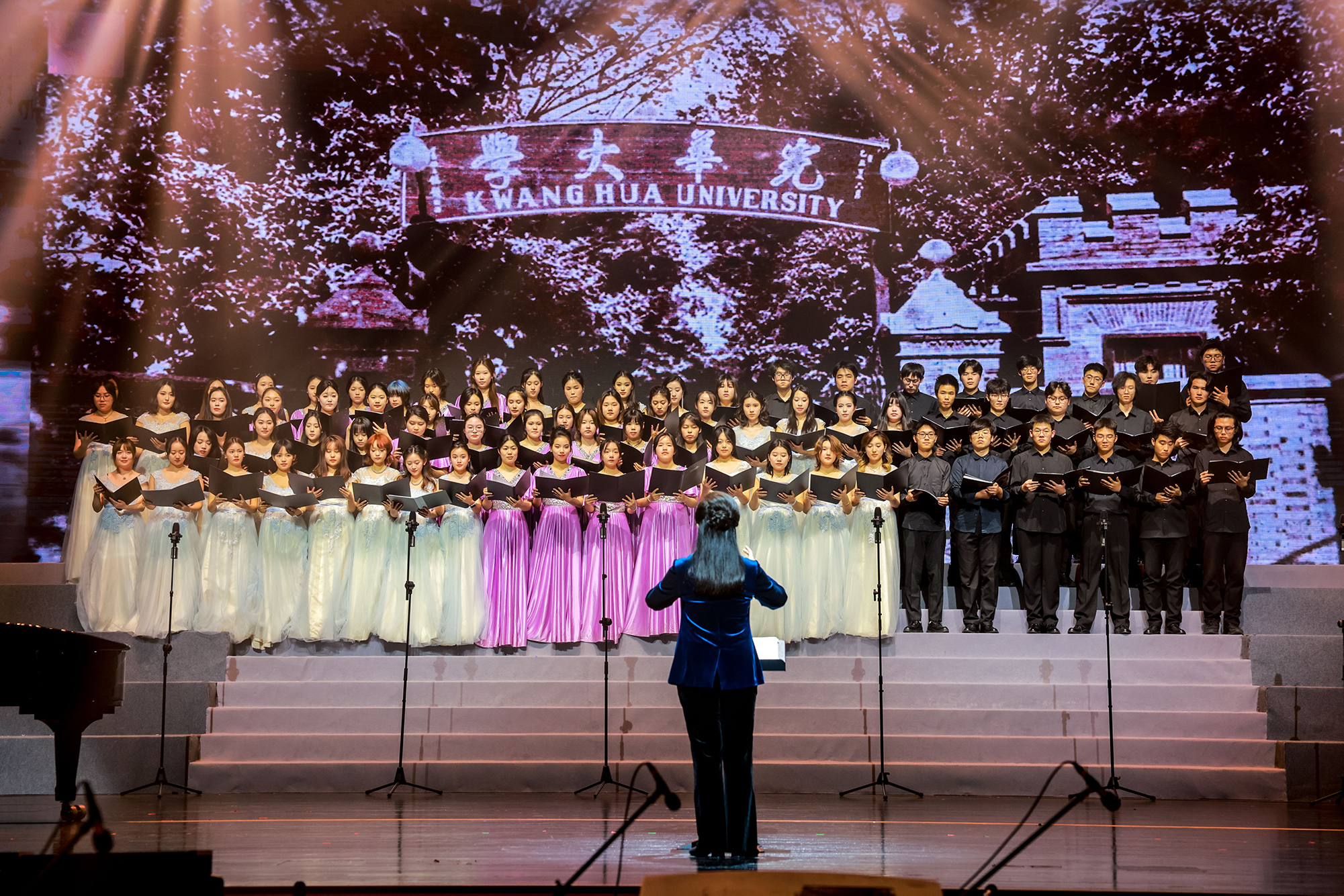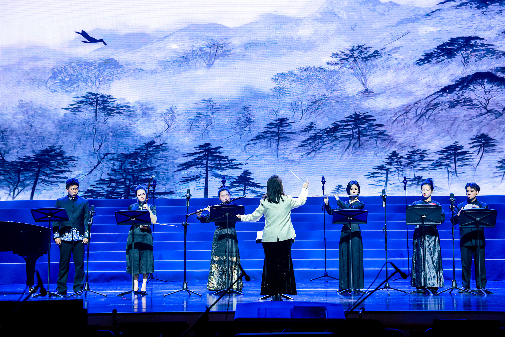 “春声筑梦”音乐会演绎的作品,既有师生们挖掘地域特色元素创作和采风改编的童谣和民歌,如《节气歌》《醴陵童谣》《女书之歌》《苏高》《月光光》《丢丢铜》《故乡素描》《家住彩云间》《摘菜调》等,也有表达对未来美好期许和激励学子奋勇前行的作品《春晓》《最好的未来》《光华大学校歌》《毕业歌》《期待的远方》,还有融合国际前沿的“手势即兴创作”体系,指挥以手势引导乐音的实时生成,AIGC技术参与生成词句与视觉影像,与原创电子音乐及人声演绎交织的作品《声无界·云墟声渡》。