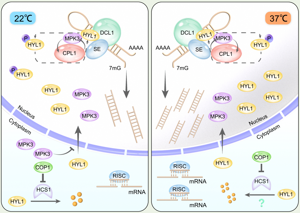 在此基础上,课题组进一步研究了高温如何诱导miR165/166的表达。令人意外的是,他们发现高温并非主要通过增加miRNA前体的表达,而是通过调控miRNA合成加工复合体来发挥作用。研究发现,在高温胁迫下,虽然加工复合体关键蛋白HYL1的总量减少,但其在细胞核内的定位增加,从而更有效地结合miRNA前体,促进成熟miRNA的产生。研究还发现,激酶MPK3和磷酸酶CPL1通过调控HYL1的磷酸化状态,影响其在细胞内的分布,进而调节植物的耐热性。时隔两年,最新研究成果再次在国际著名期刊 The Plant Cell 发表。该研究首次阐明了植物通过调控miRNA加工复合体来应对热胁迫的新机制。