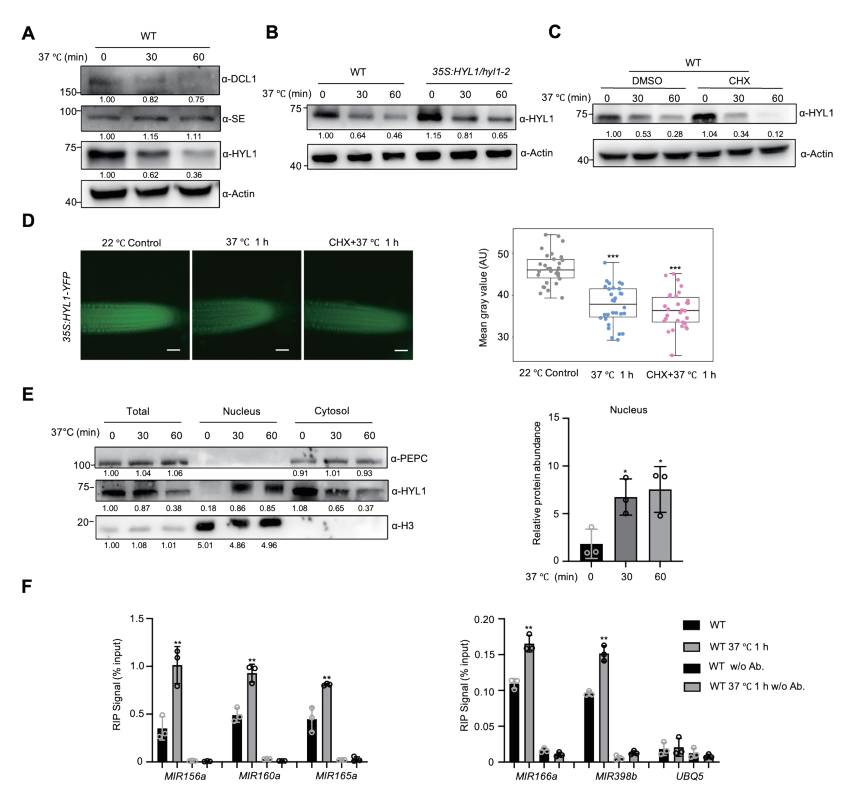 高温促进miRNA加工复合体关键因子HYL1进入细胞核。