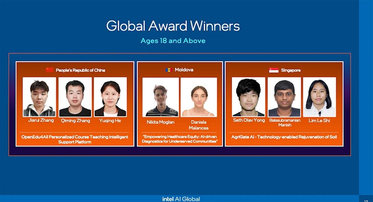 3245澳门新莆京OpenEdu4All团队(左一)斩获2024年英特尔人工智能全球影响力嘉年华18岁以上年龄组全球大奖