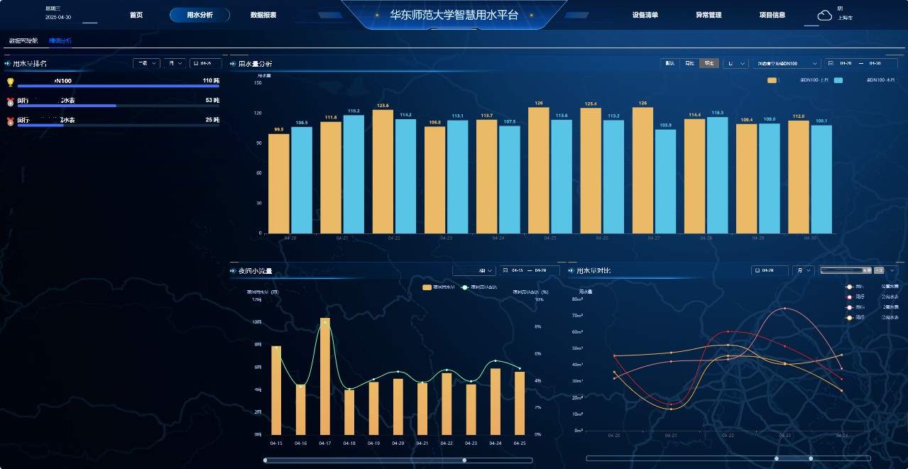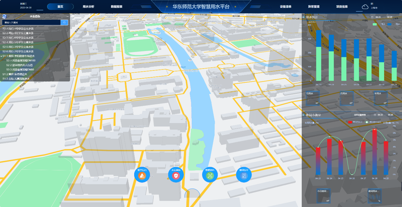 智慧用水管理平台系统部署智能水表及传感器,300+个水计量点位,实时监测各楼宇用水数据,结合夜间最小流量分析模块,精准识别管网渗漏,并通过用水异常预警功能及时定位异常消耗,实现漏损控制智化。2025年一季度闵行校区用水量同比下降9%,生动诠释了科技赋能资源集约化的双重价值。