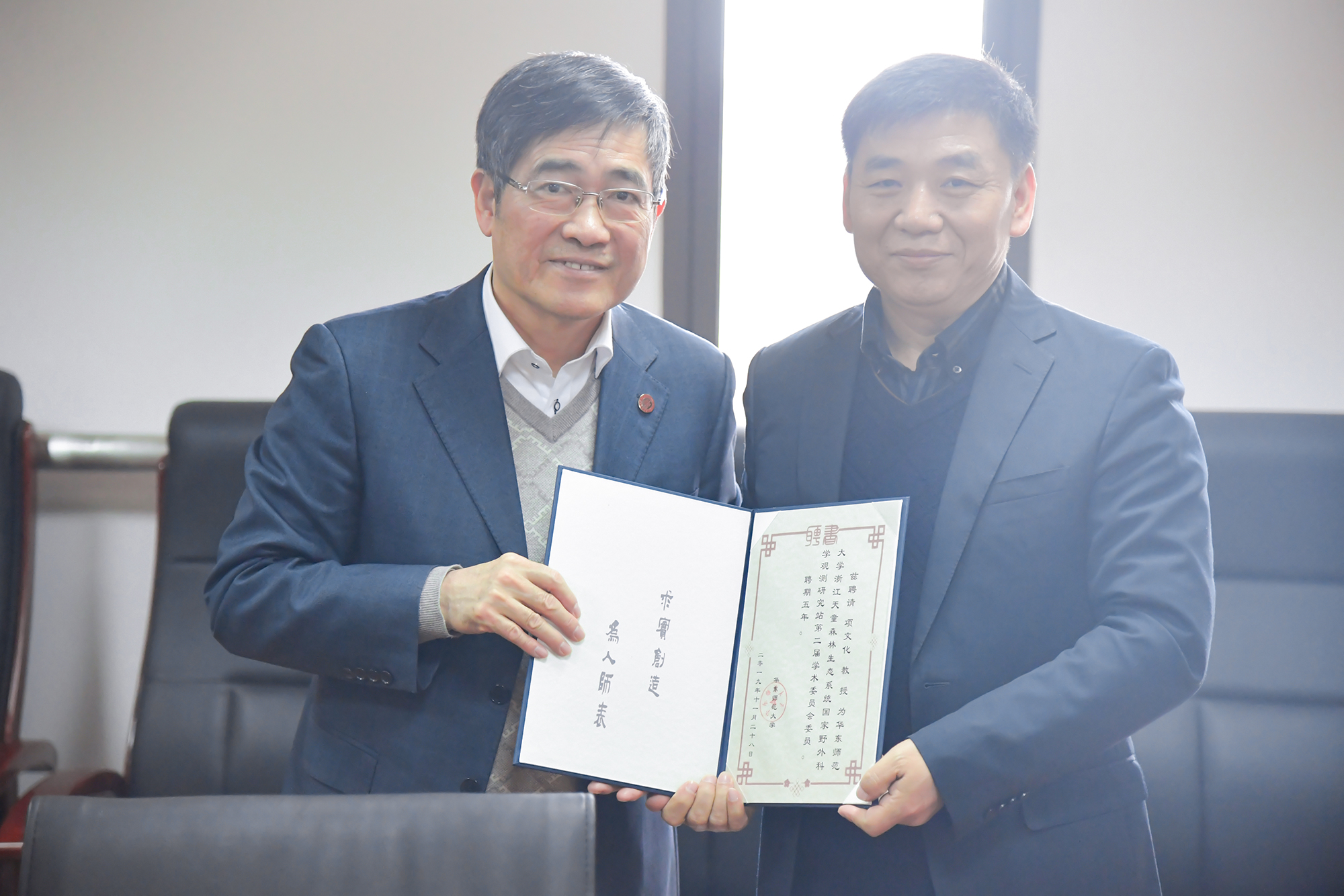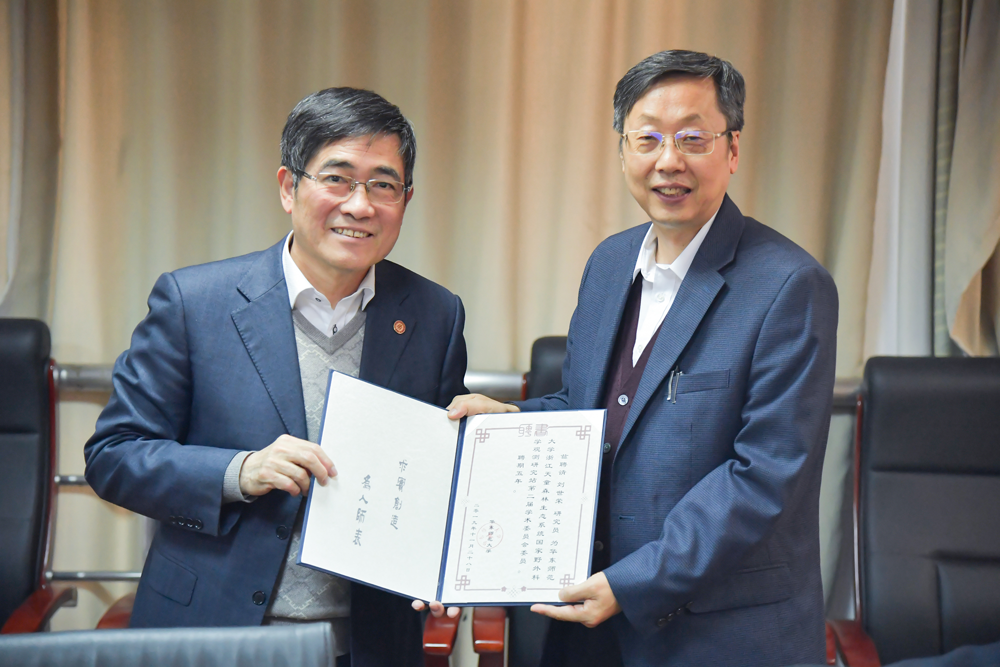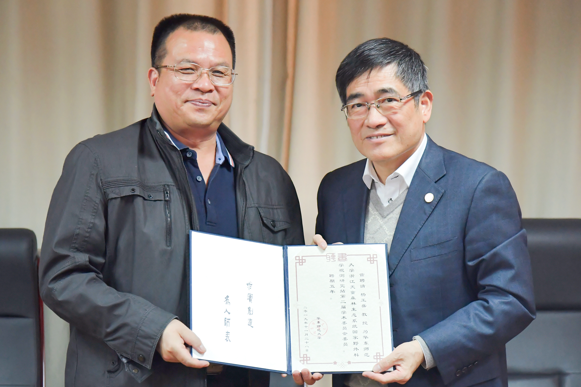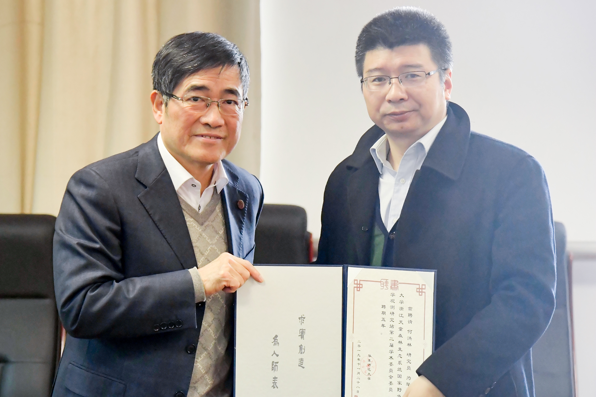 校党委书记童世骏向天童站第二届学术委员会委员杨玉盛教授颁发聘书
