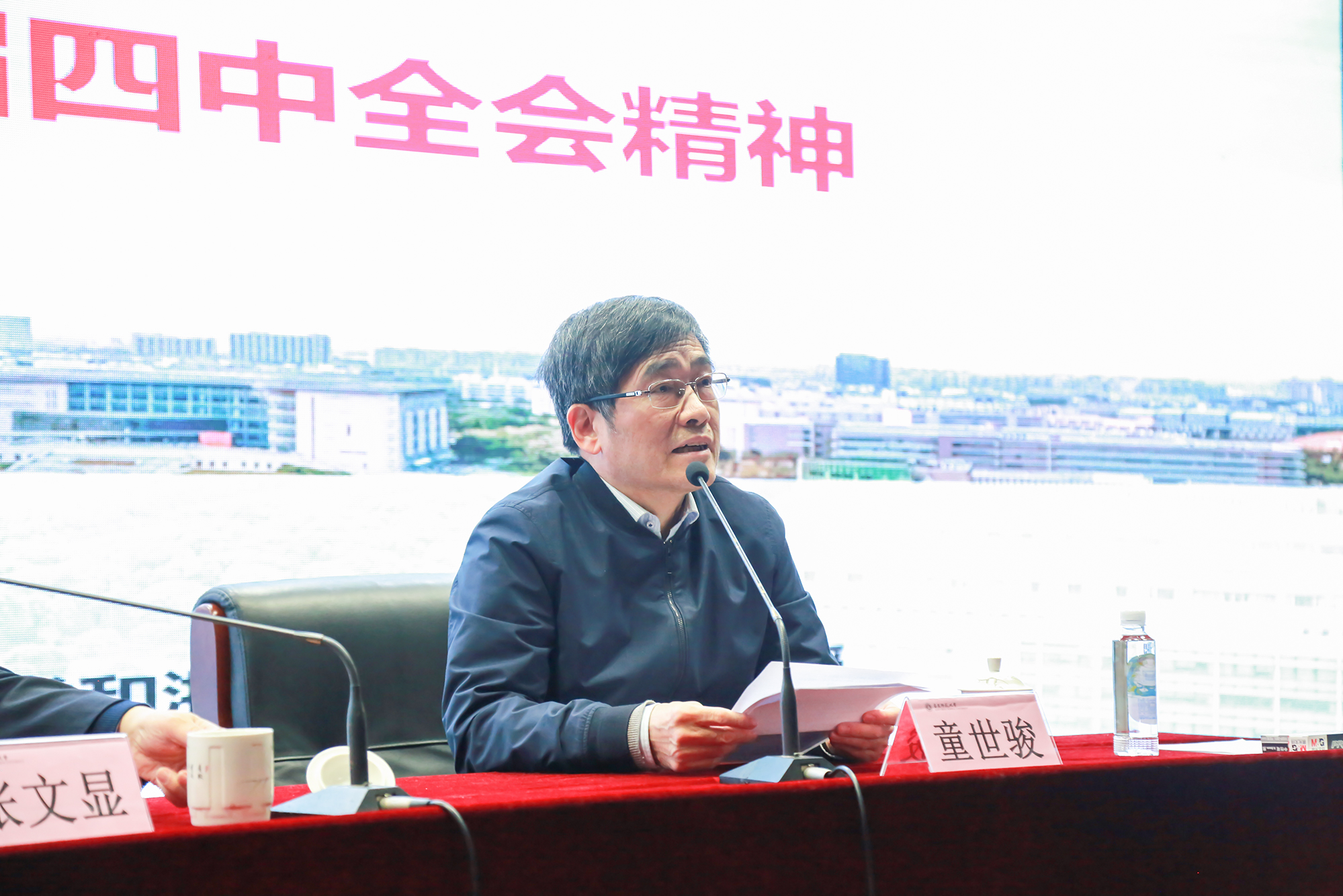 童世骏指出,10月28日至31日,党的十九届四中全会在北京召开,这是党在庆祝新中国成立70周年的重要节点,在“两个一百年”奋斗目标历史交汇点上召开的一次具有开创性、里程碑意义的会议,这次会议专题研究了坚持和完善中国特色社会主义制度、推进国家治理体系和治理能力现代化的问题,会议通过的《决定》通篇贯穿着坚定自信、坚守根本、改革创新的精神。