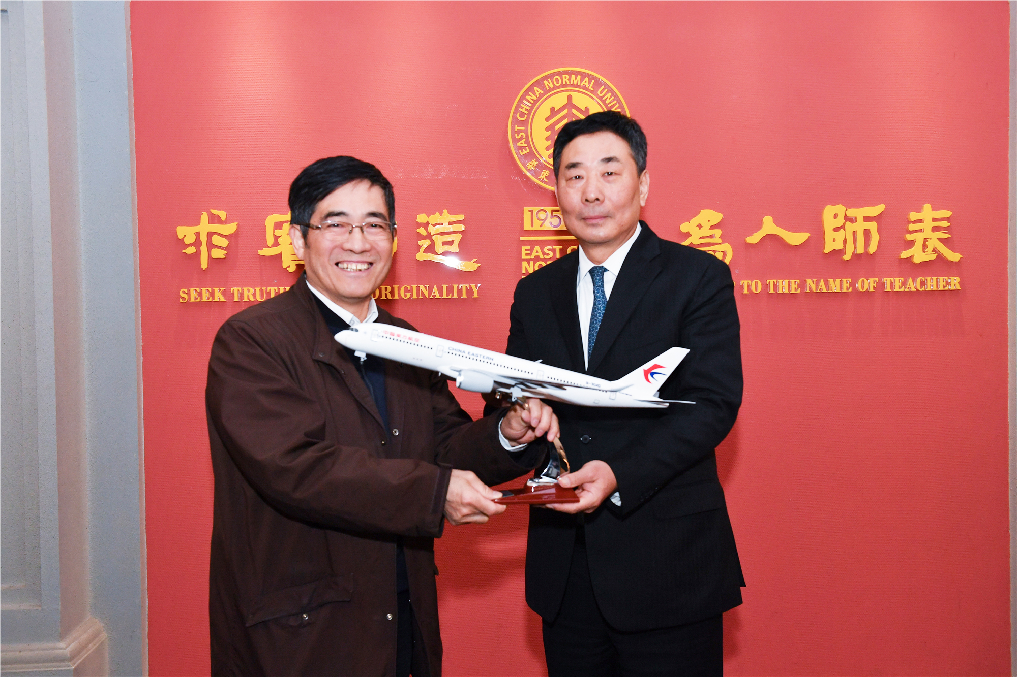 中国东方航空集团有限公司董事、总经理、党组副书记李养民代表东航向华东师大赠送飞机模型