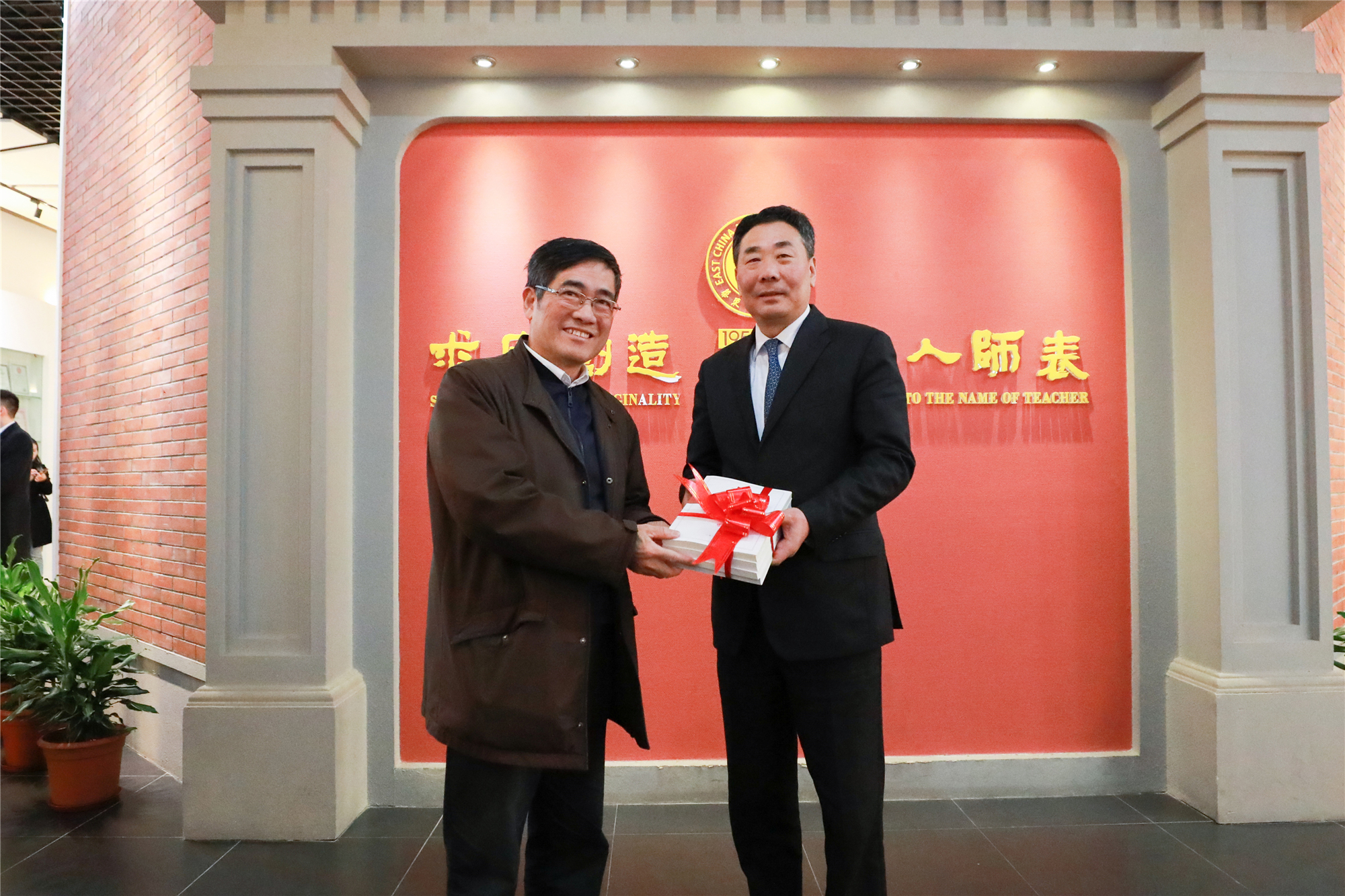 报告会前,李养民一行还在华东师大党委书记童世骏一行的陪同下,参观了华东师大校史馆,了解学校建校和发展历程。童世骏向李养民一行介绍了学校作为新中国组建的第一所社会主义师范大学的建校历史,追忆几代华东师大人一以贯之的教育报国初心和使命。他表示,华东师大将在新时代继续坚守初心,勇担使命,“建教育强国,以教育强国”。童世骏还与李养民代表校企双方互赠礼物,祝愿校企不断深化合作,合力育人。