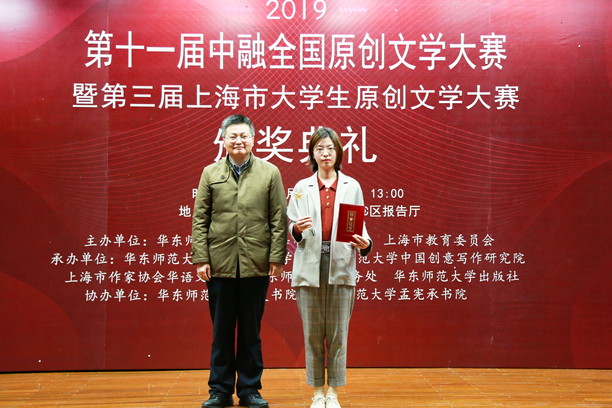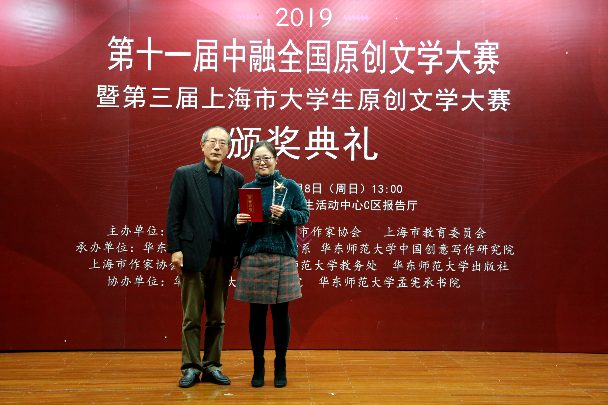 12月8日,第十一届中融全国原创文学大赛暨第三届上海市大学生原创文学大赛颁奖典礼在华东师大闵行校区大学生活动中心举行。本次大赛由华东师大、上海市作家协会和上海市教育委员会主办,华东师大中文系、华东师大中国创意写作研究院、上海市作家协会华语文学网、华东师大教务处、华东师大出版社承办,华东师大大夏书院、孟宪承书院协办。