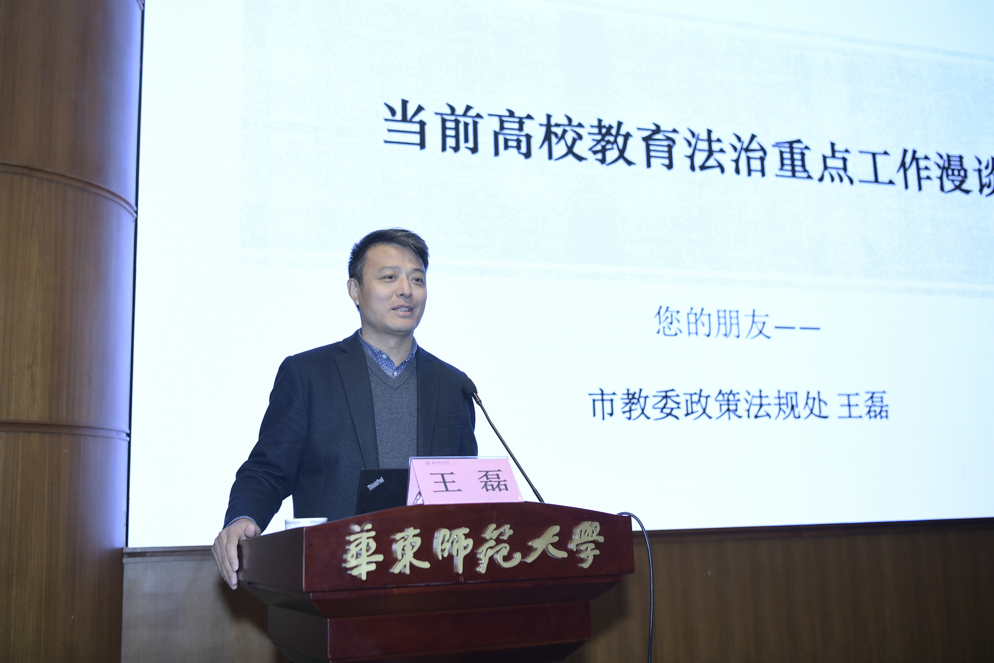在上午的主旨报告中,上海市教委政策法规处处长王磊围绕“依法治校和研究生管理”的主题,重点解读了当前高校教育法治的重点工作。他从问题导向、需求导向、目标导向三方面分析了新形势,并结合具体的案例从“职责到位、法律优位、管理归位、各就其位、关注错位、做实C位、商讨缺位”高校教育管理依法行政的七类重点方面剖析了新任务。