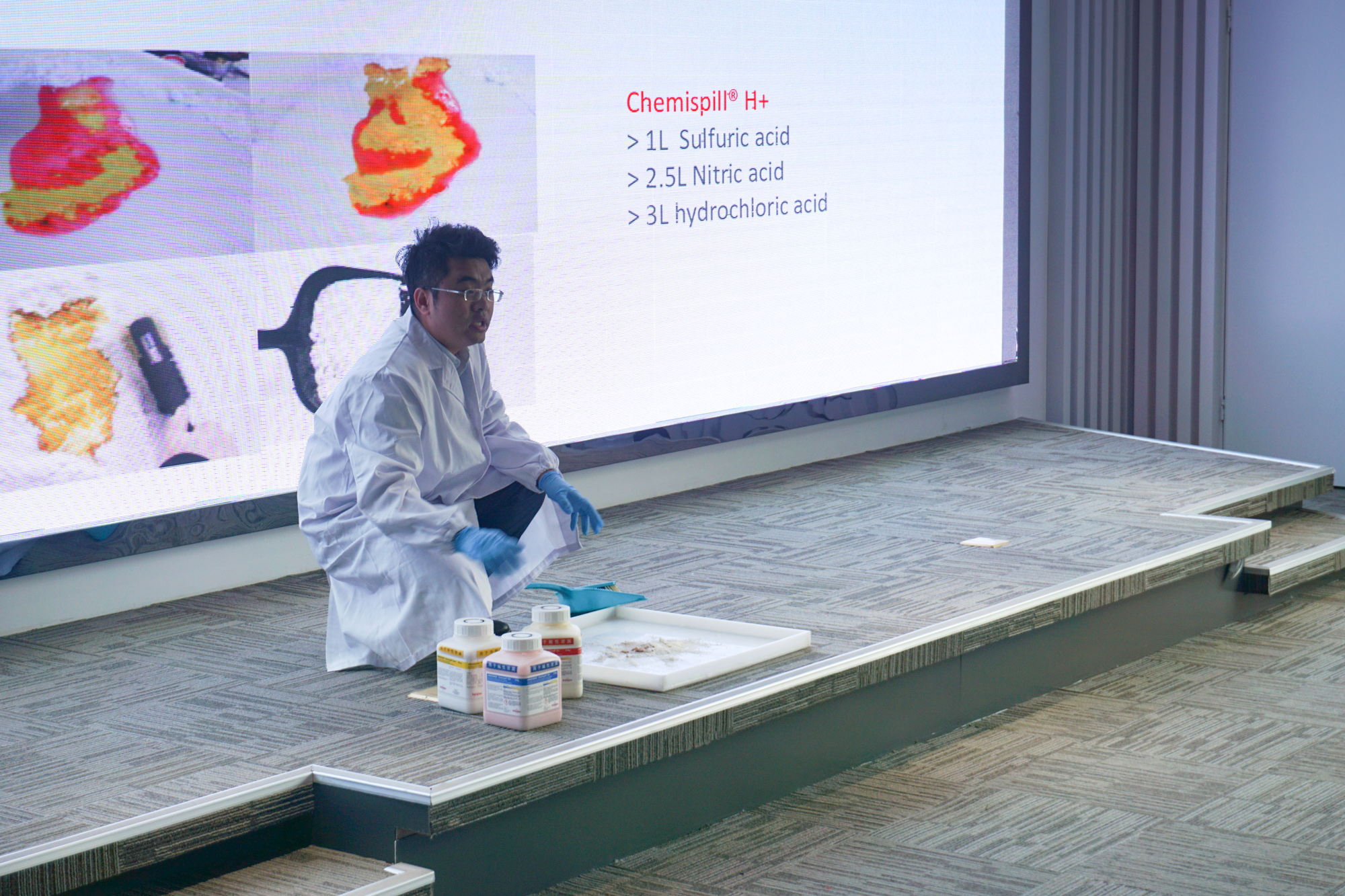 随后,君源环保EHS安全管理研发中心首席顾问为大家作题为“实验室危险化学品管理与泄漏安全处置”的专题培训,系统介绍了我国对于危险化学品的安全管理概况以及实践经验,并列举了大量安全事故案例,对我校的实验室安全管理工作具有重要的指导和警示意义;西班牙萨劳(scharlau)有限公司为大家现场演示了化学品泄漏的应急处置操作方法及相关产品。