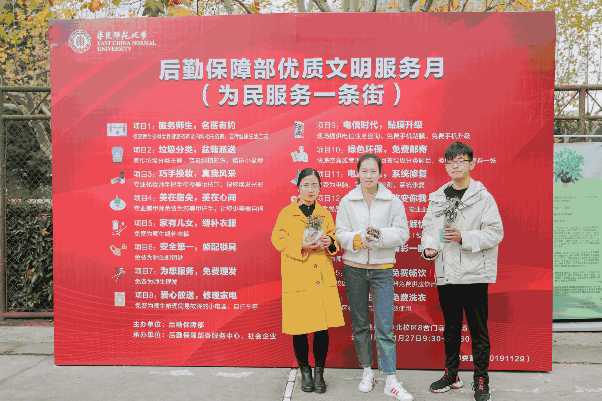 11月27日,后勤保障部优质文明服务月之“为民服务一条街”活动在中北八舍门前篮球场举行,经过前期精心的筹备和协调,现场12个服务单位的百余名后勤员工为师大师生共呈现了14个服务项目。