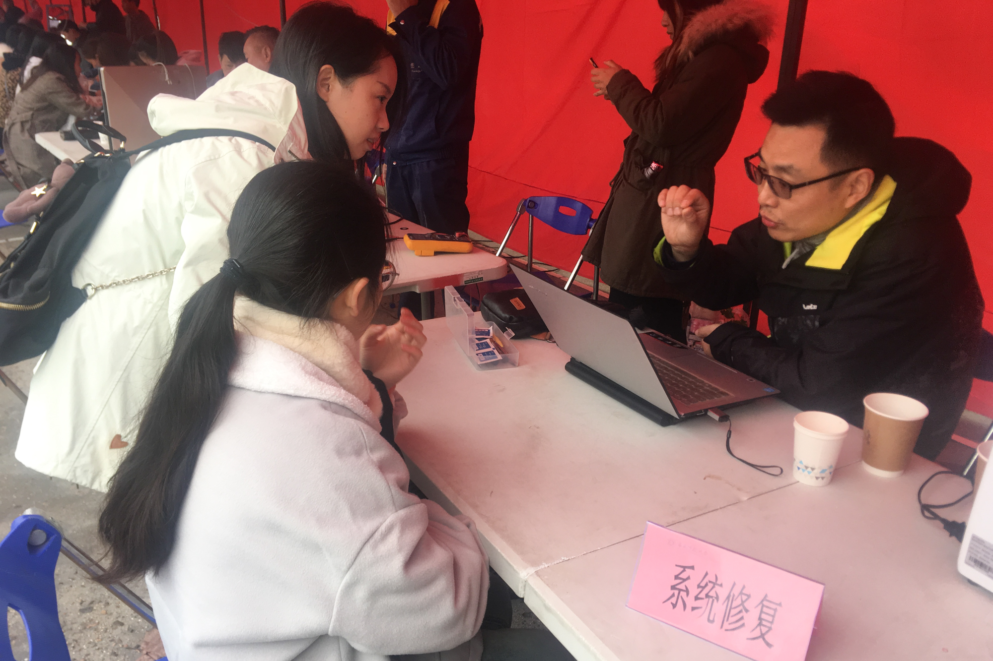 免费缝补衣物、拍摄证件照、电脑修复三项服务
