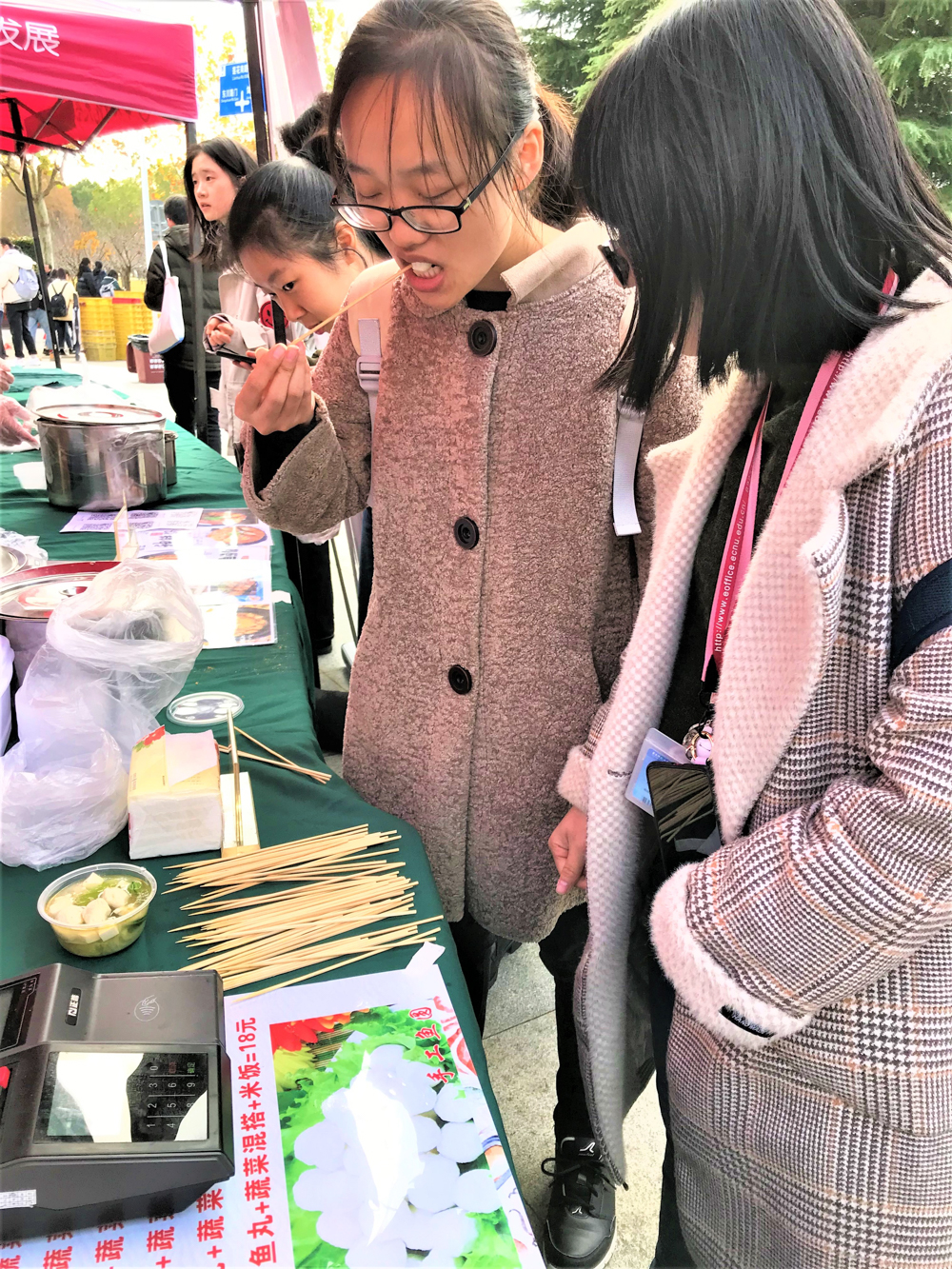 上午10:00,工作人员开始准备各自特色的点心和菜肴,工作台上已摆好了琳琅满目的美食。有色泽诱人的西式糕点、有肥而不腻的中式荤肉和色味俱佳的精致面点。上午10:30,香味四溢的美食吸引了广大师生前来采购,热情红色的遮阳棚下已经人气满满。各参展单位前人气盛况可嘉。师生们手上沉甸甸的拎着、嘴里津津有味的吃着,最后不忘给出自己的评价。喜欢甜食的可以选择甜味飘香的香糯甜藕,爱好辛辣的可以免品一碗神鲜汤,口齿留香,热爱养生美容的可以来只美味的蹄膀。入冬的校园因为食品节的举办显得格外绚烂多彩。