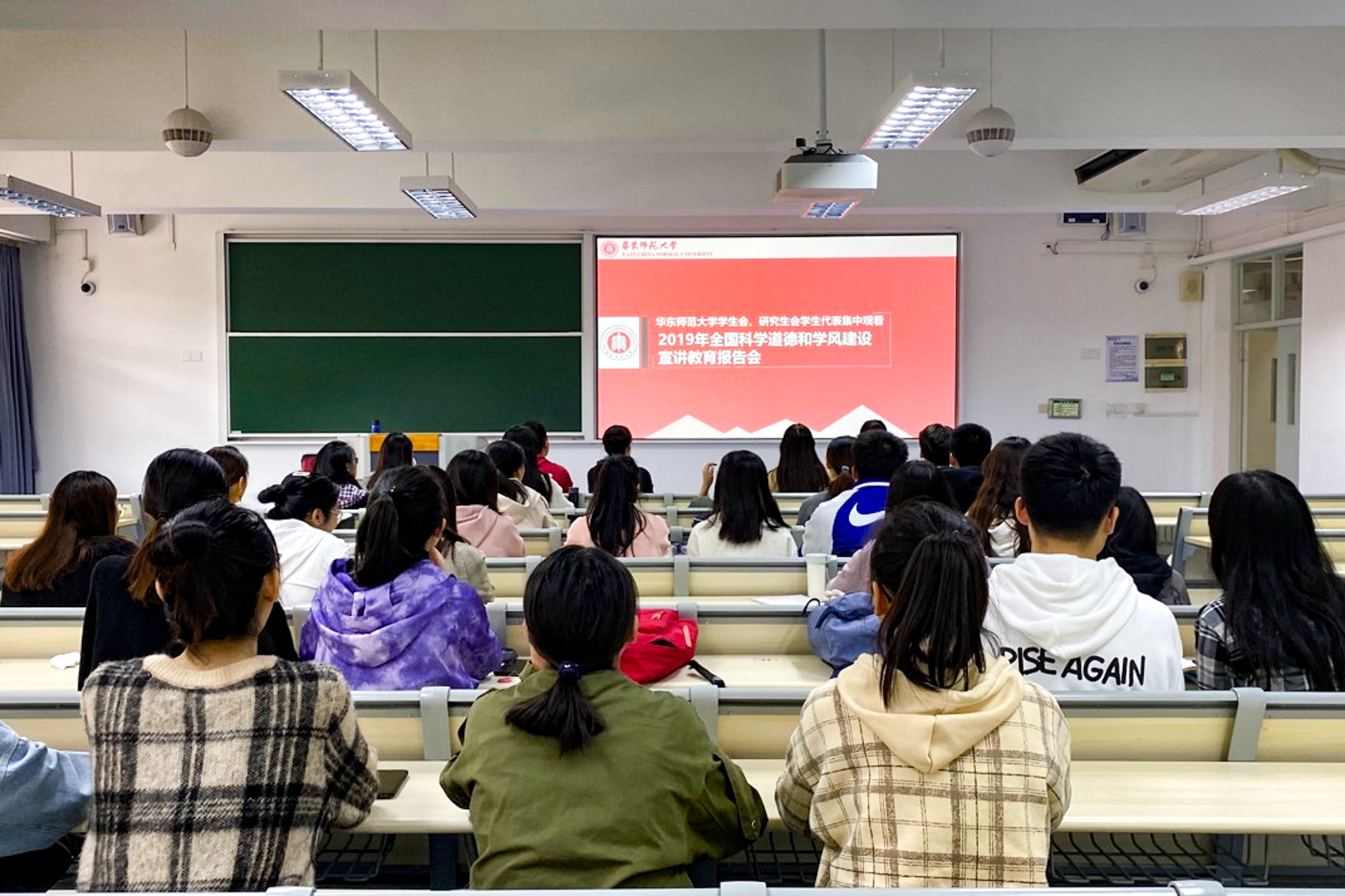 为学习贯彻习近平新时代中国特色社会主义思想和习近平总书记关于科学道德和学风建设重要指示精神,落实《关于进一步弘扬科学家精神加强作风和学风建设的意见》要求,深入推进科学道德和学风建设宣讲教育工作,由中国科学技术协会、教育部、中国科学院、中国社会科学院、中国工程院、国家自然科学基金委员会、北京市人民政府共同主办的2019年全国科学道德和学风建设宣讲教育报告会于11月13日在人民大会堂举办。3000余名华东师大师生在校内46个会场集体在线观看学习2019年全国科学道德和学风建设宣讲教育报告会。
