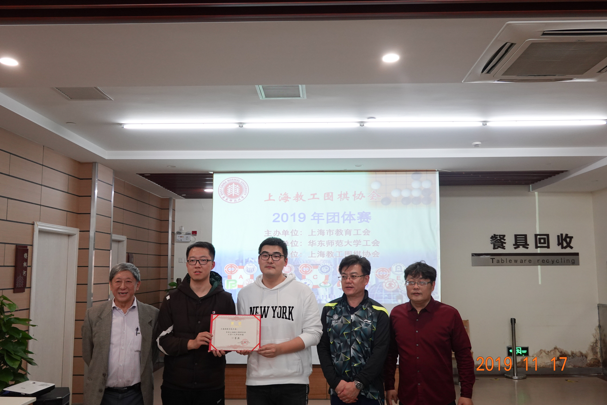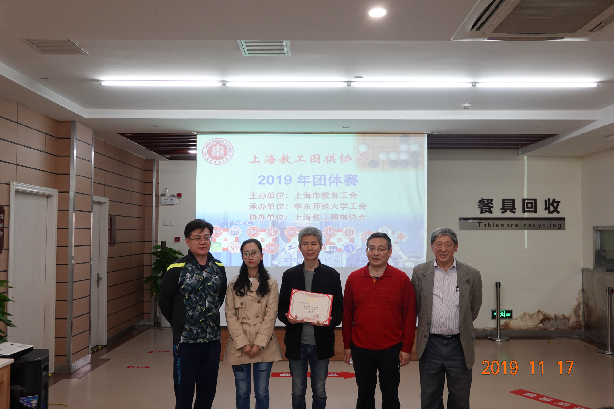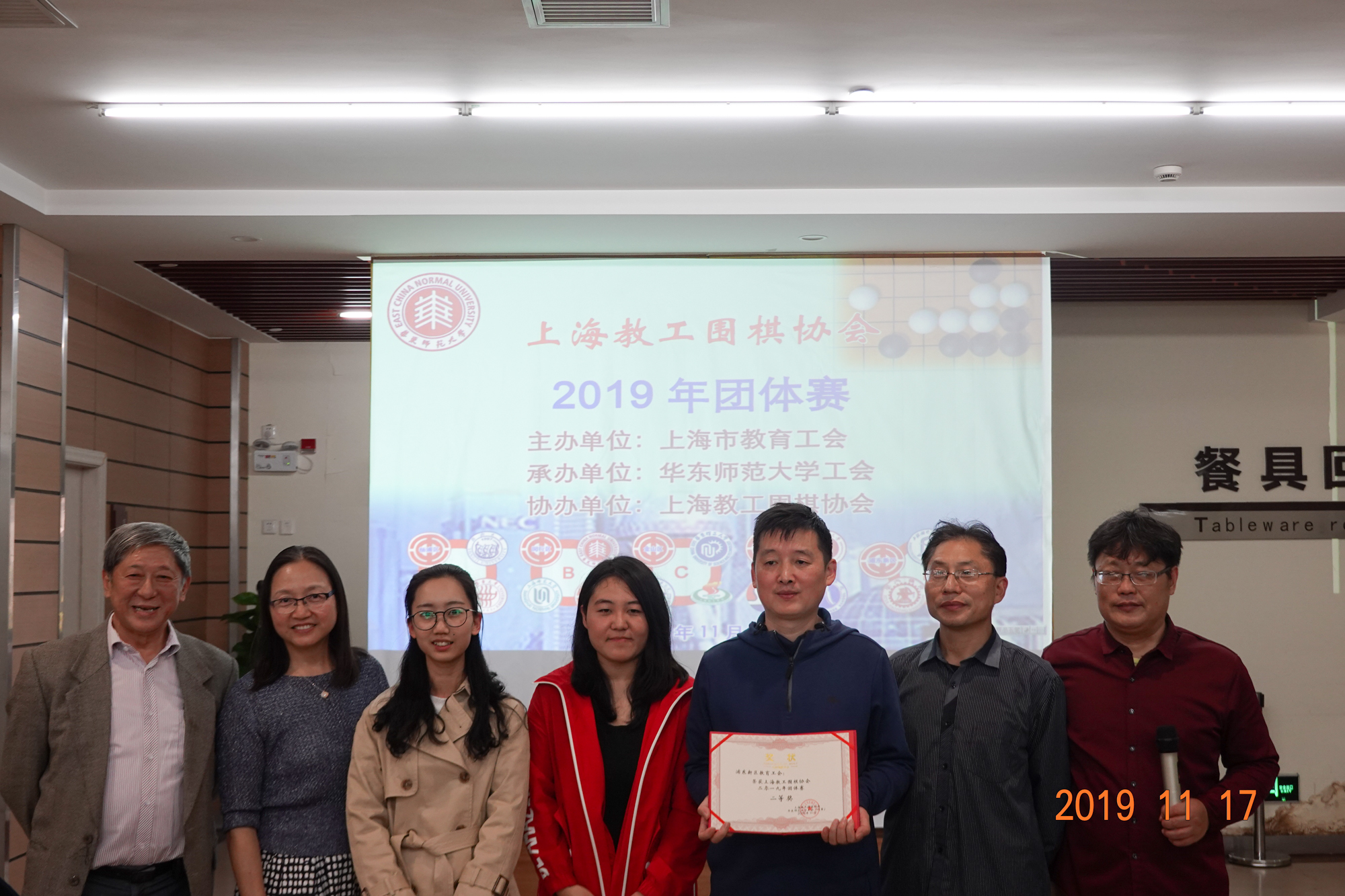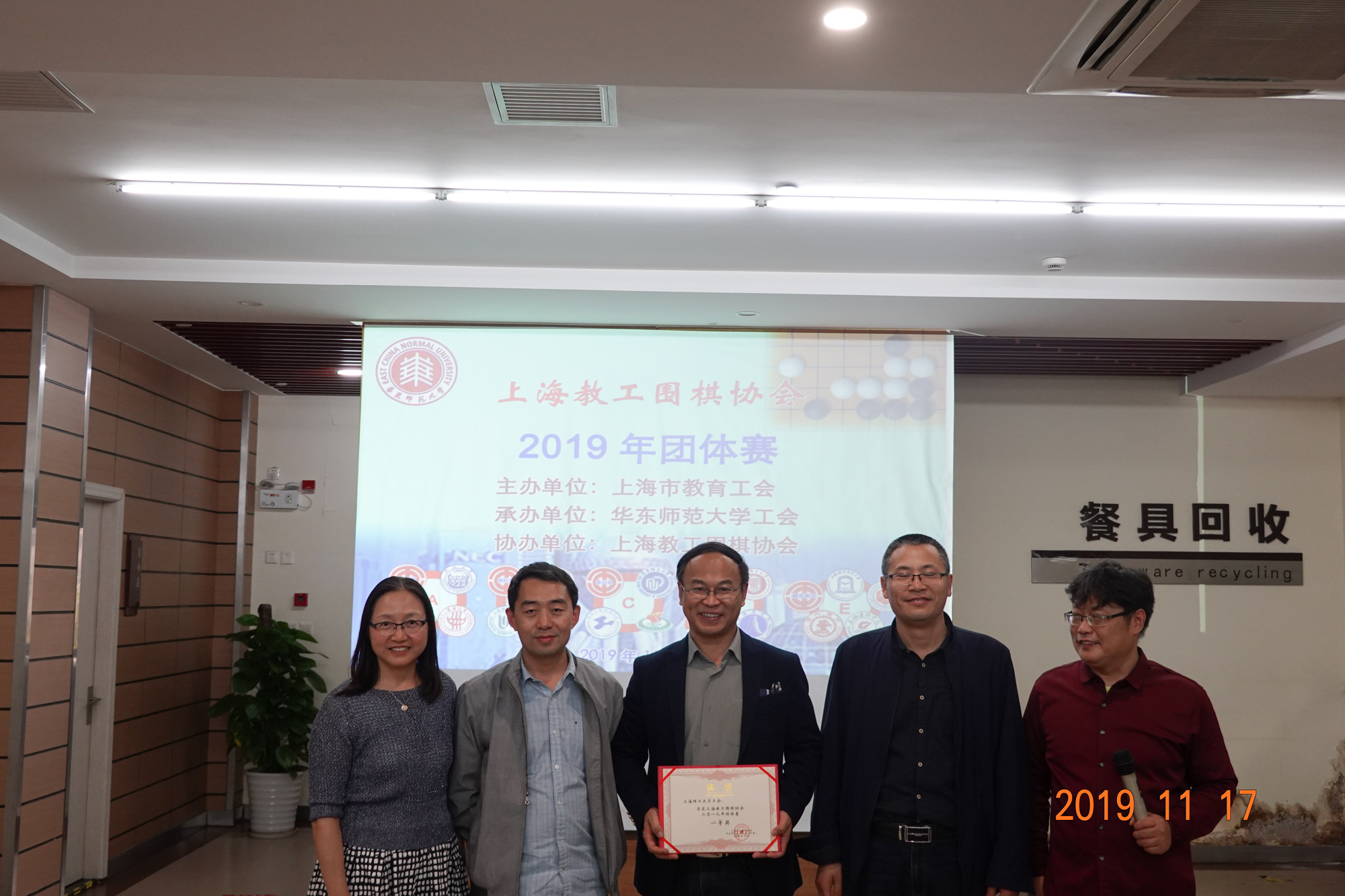 颁奖仪式上,上海教工围棋协会会长赵文庆、上海交通大学工会主席于朝阳、3245澳门新莆京工会常务副主席王平、3245澳门新莆京工会副主席李小英、静安区教育工会副主席李擎分别为获奖团队颁发奖状。